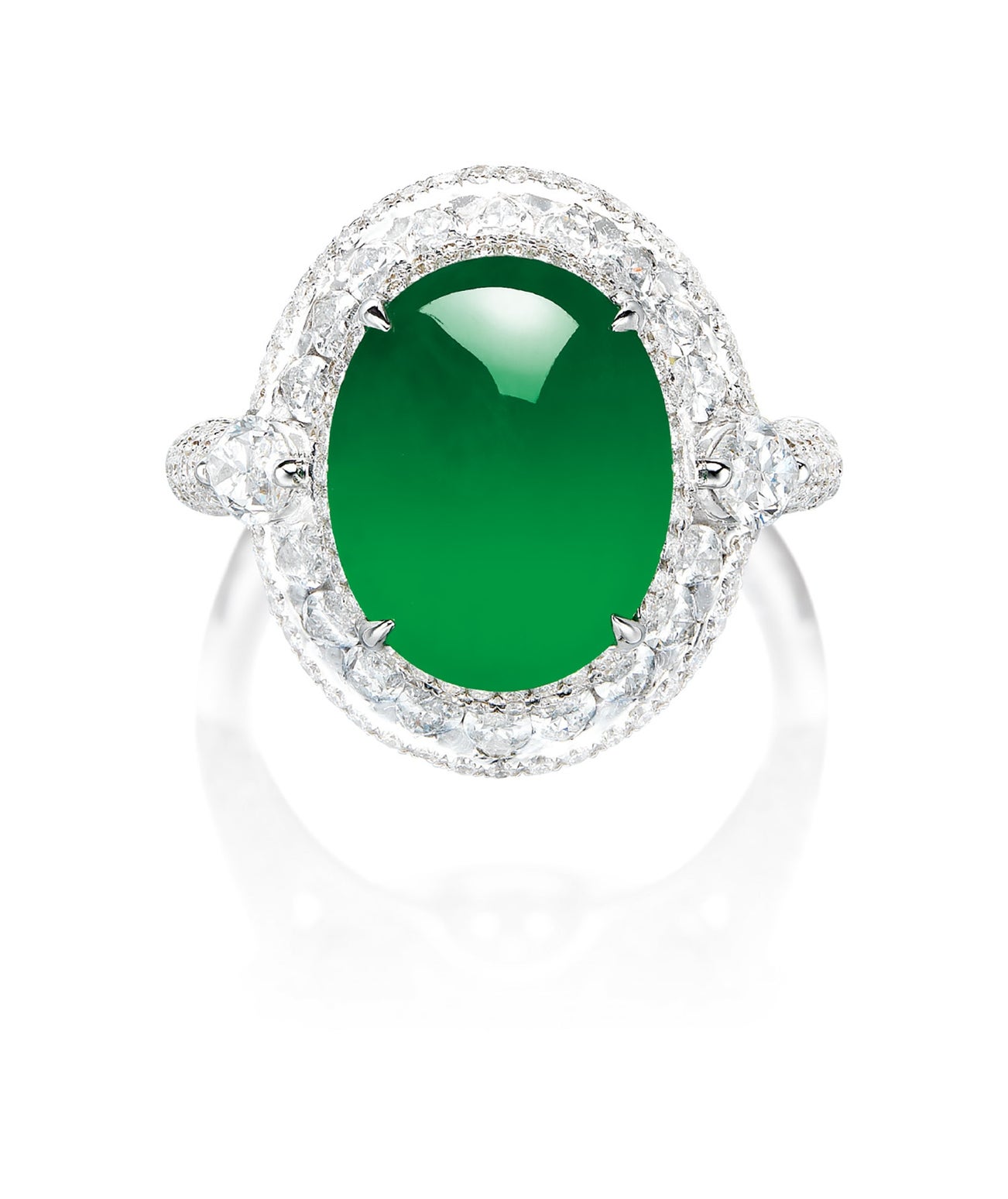 One oval jadeite cabochon, <em>measuring approximately 13.32 x 10.57 x 3.86mm </em>Marquise-shaped and brilliant-cut diamonds on gallery and shank18 karat white gold(Jadeite Cabochon)