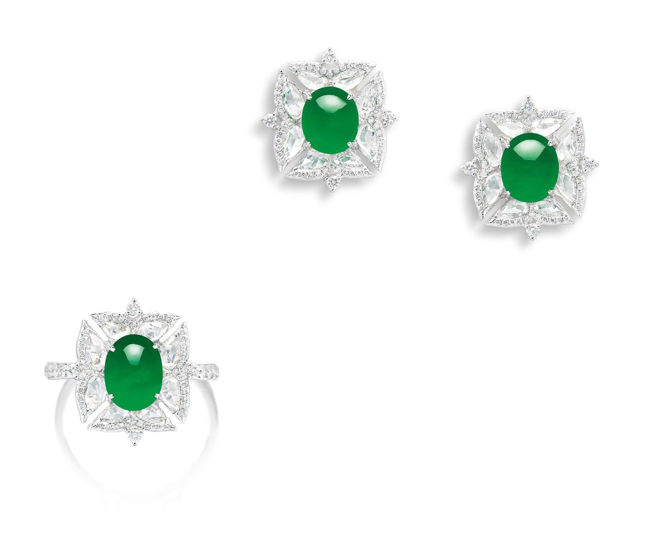 RING - An oval jadeite cabochon, <em>measuring approximately 8.51 x 6.45 x 4.05mm </em>EARRINGS - Two oval jadeite cabochons, <em>measuring approximately 7.85 x 6.50 x 3.03mm and 7.73 x 6.47 x 3.20mm respectively </em>Surrounded by rose- and brilliant-cut diamondsBoth in 18 karat white gold(Jadeite Cabochons)