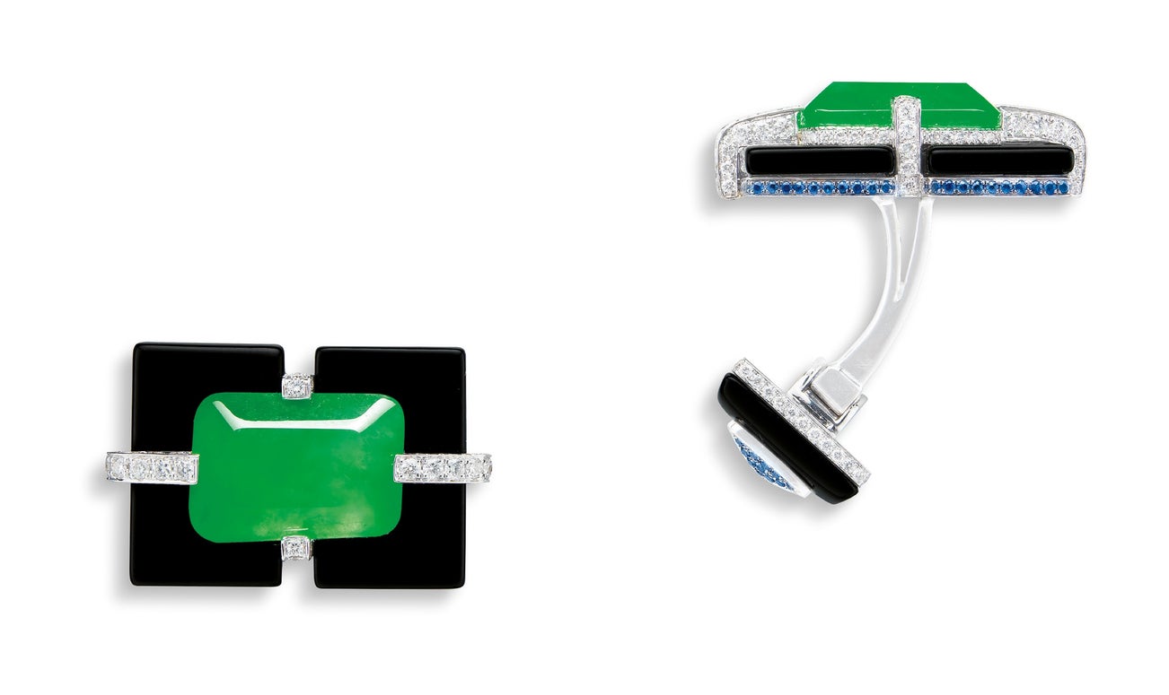 A Pair of Jadeite, Onyx and Diamond Cufflinks