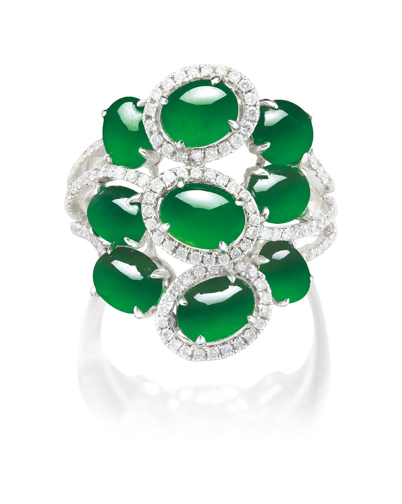 Nine jadeite cabochons, <em>measuring approximately 6.71 x 5.06 x 2.85mm to 5.25 x 4.20 x 2.20mm</em>Tiny brilliant-cut diamonds in the surround and split shank18 karat white gold(Nine Jadeite Cabochons)