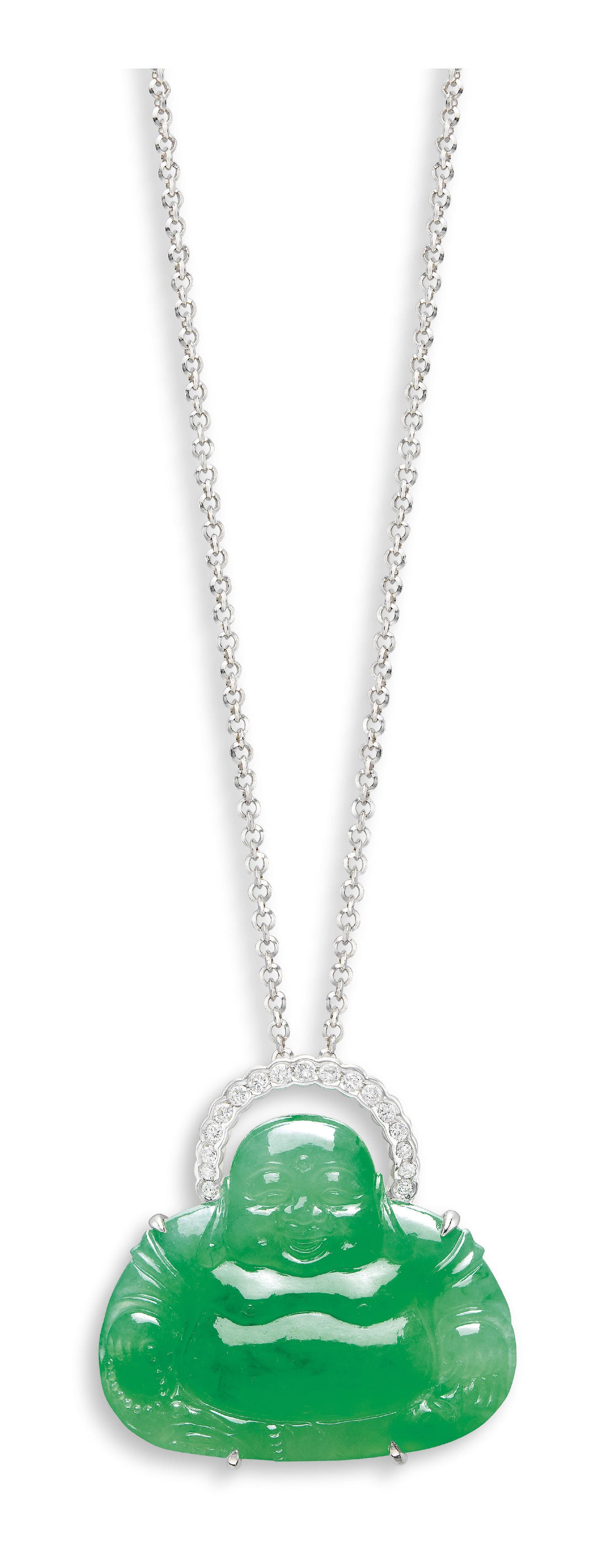 A carved jadeite 'Buddha', <em>measuring approximately 25.69 x 30.86 x 4.30mm </em>Brilliant-cut diamonds on the surmount18 karat white gold<em>With a karat white gold link-chain, maximum length measuring approximately 450mm</em>(Jadeite 'Buddha')