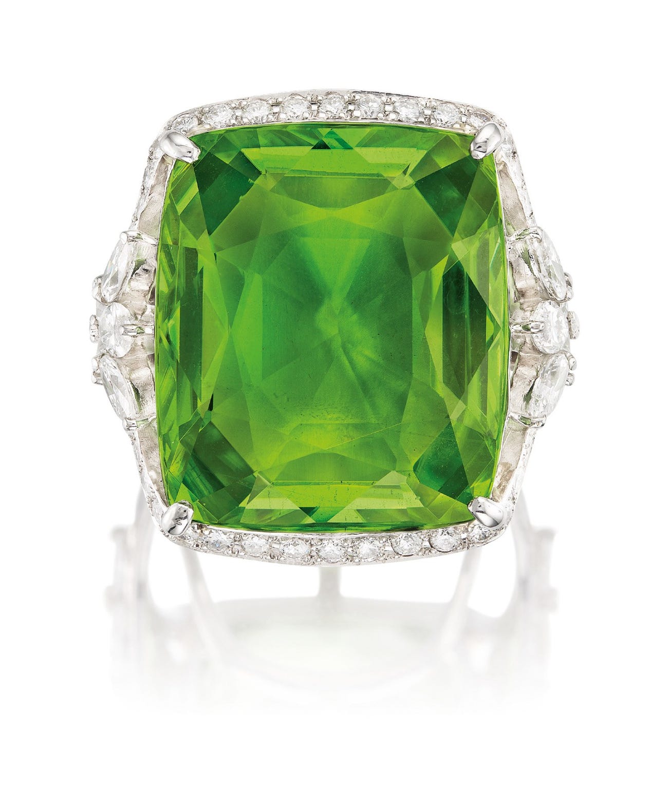 One cushion-shaped peridot, 45.36 caratsBrilliant-cut and marquise-shaped diamonds on the surround and shouldersPlatinum(45.36-carat Peridot)