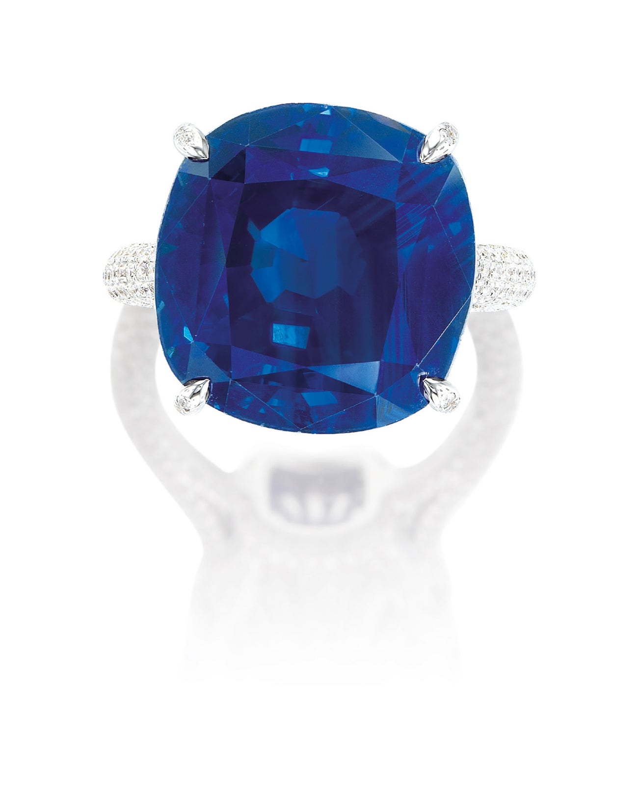 One cushion-shaped sapphire, 29.51 caratsTapered baguette and brilliant-cut diamonds on the surround and gallery18 karat white gold(29.51-carat Sapphire)
