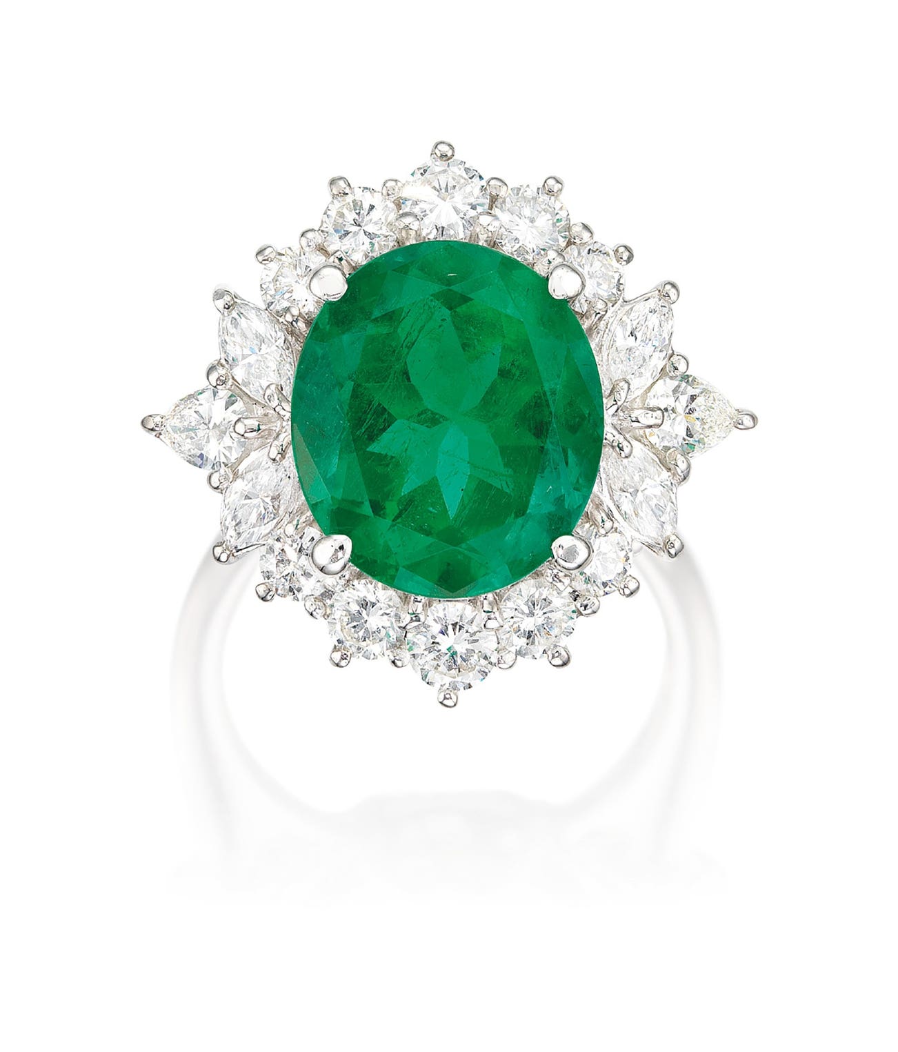 One oval emerald, 5.34 caratsSurrounded by circular and marquise-shaped diamondsPlatinum(5.34-carat Emerald)