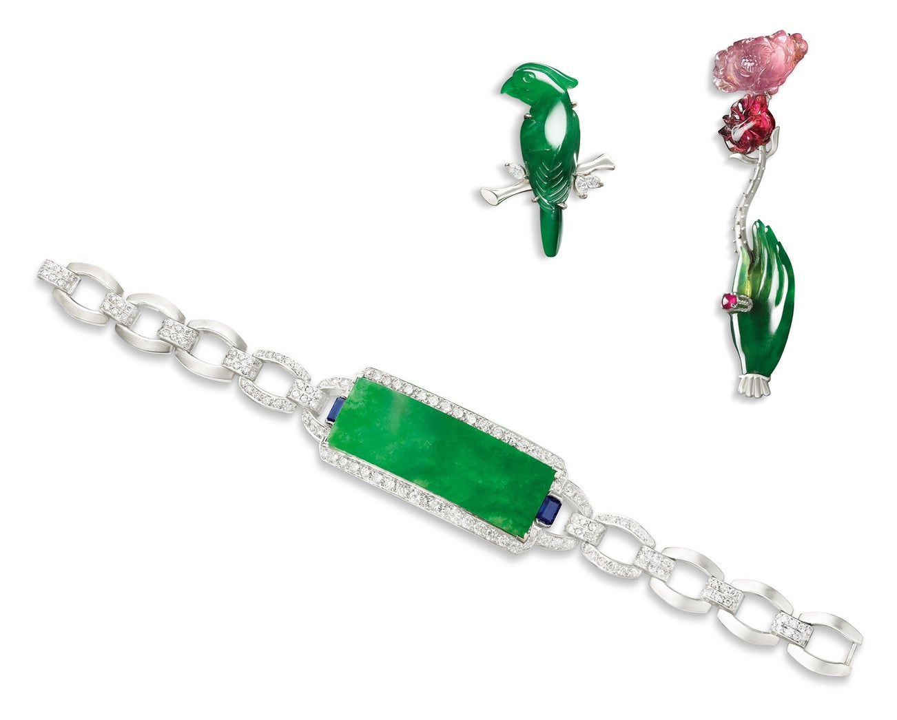 A jadeite 'Buddha's-hand', <em>measuring approximately 27.56 x 11.62 x 5.06mm</em>, decorated by pink tourmaline flowers, 14 karat white gold(Three Jadeite)