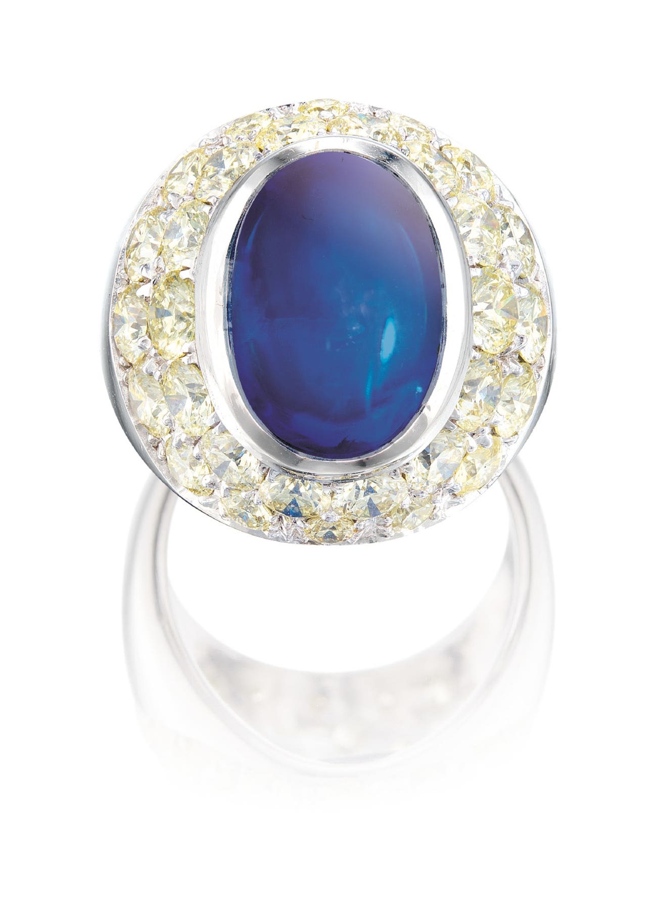 One oval cabochon sapphire, 16.17 caratsSurrounded by two rows of brilliant-cut diamonds18 karat white gold(16.17-carat Sapphire)