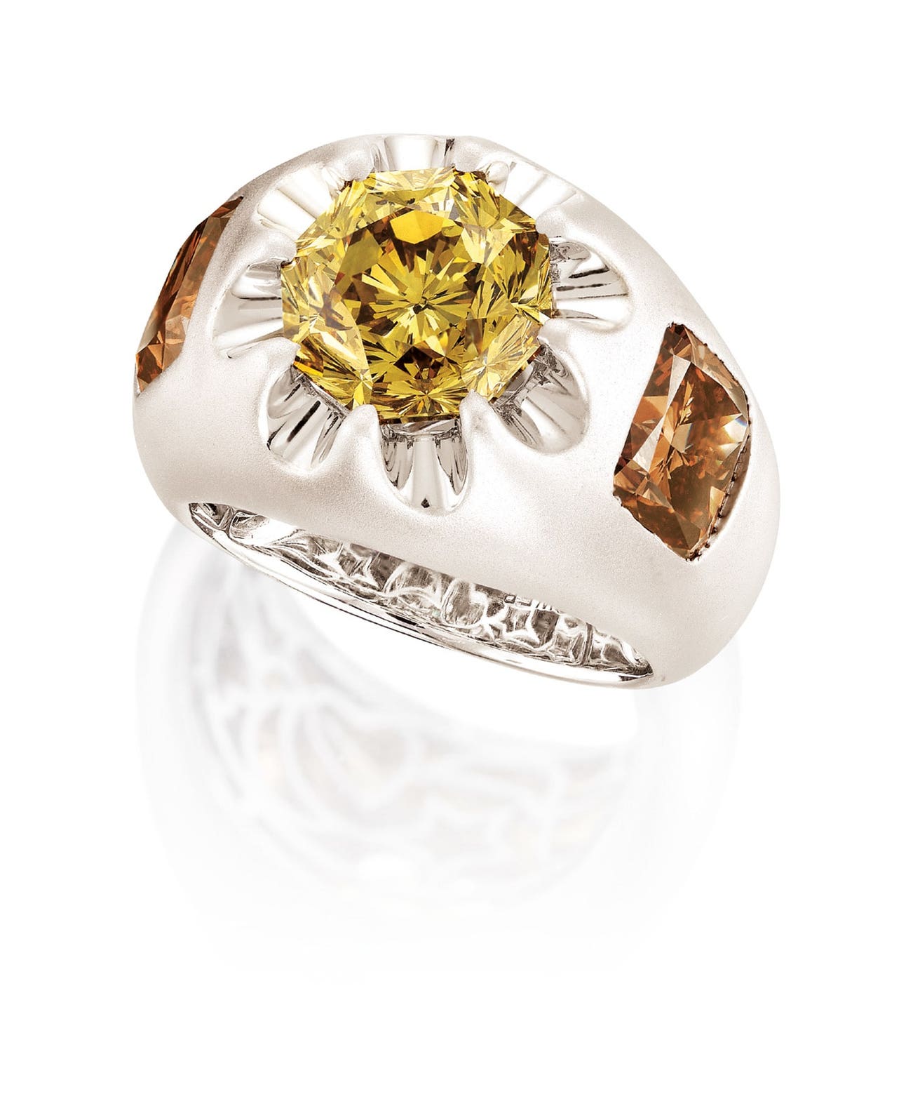 One octagon-shaped diamond of brownish yellow colour, 5.49 caratsFlanked by two cushion-shaped coloured diamonds, 3.25 and 3.24 carats respectively18 karat white gold