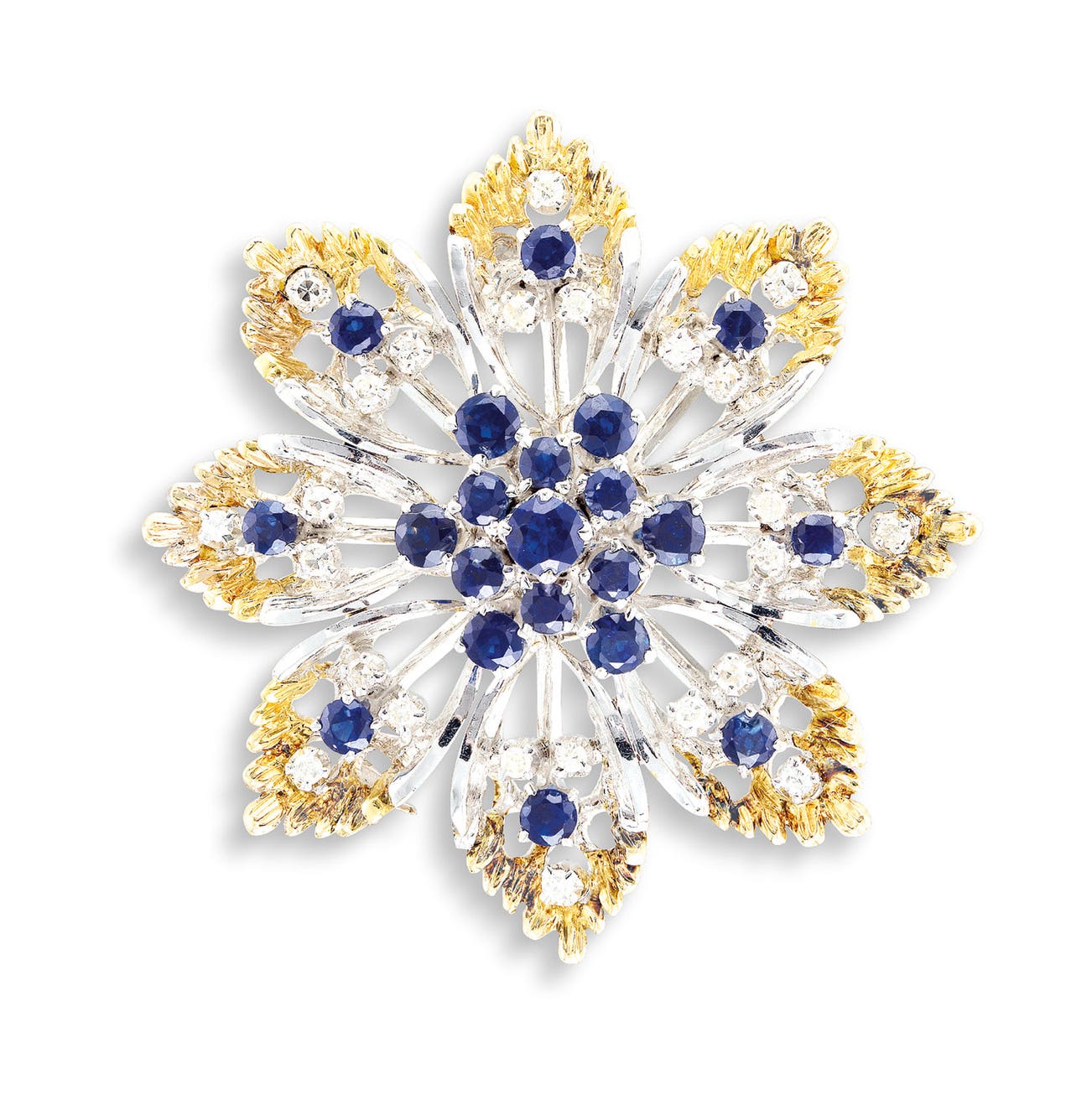 Stamen and petals set with twenty-one sapphiresDecorated with circular-cut diamondsPlatinum and 18 karat yellow gold<em>With pendant loop fitting </em>
