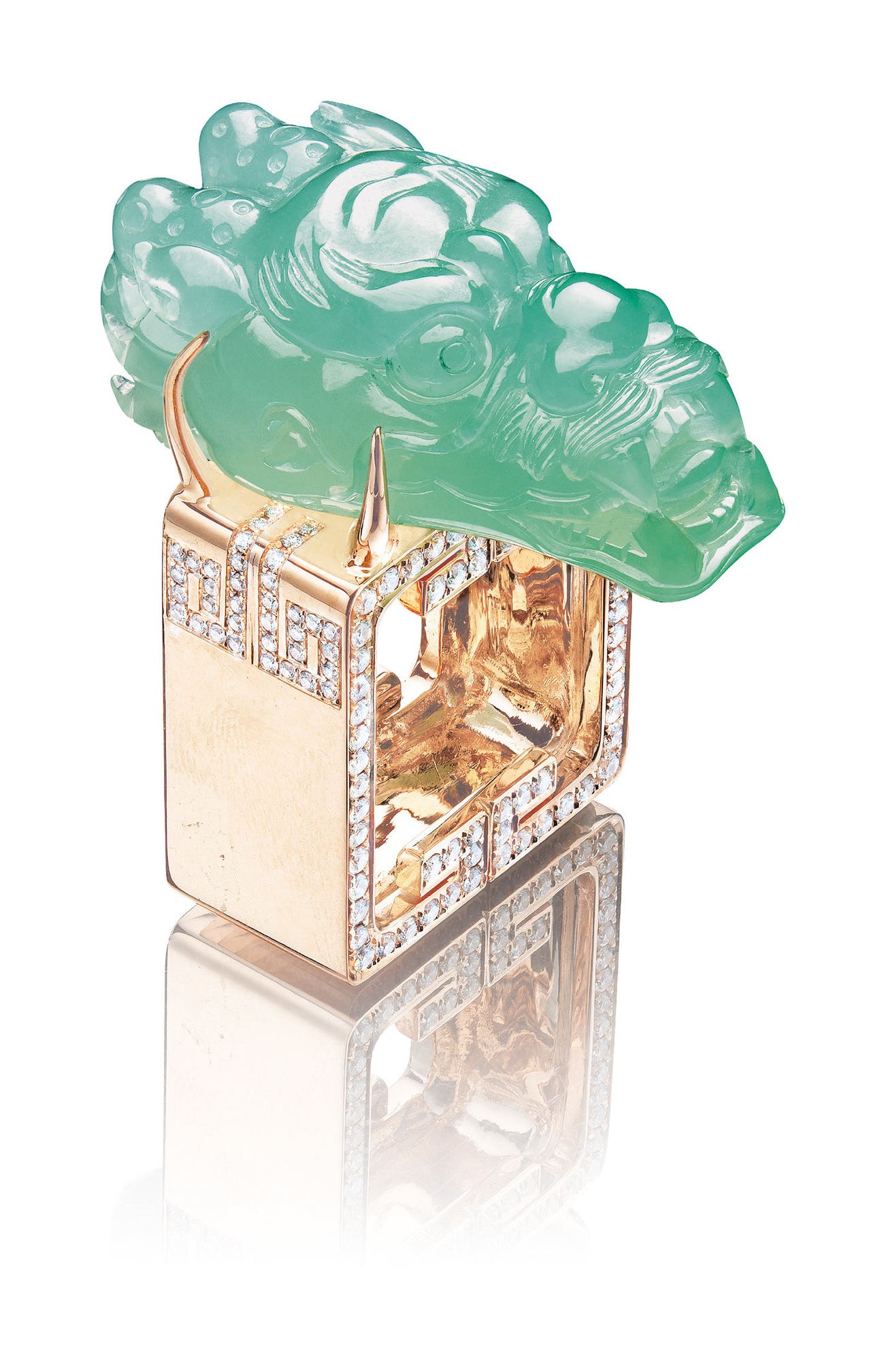 A carved jadeite 'dragon-head', <em>measuring approximately 36.86 x 21.51 x 13.51mm</em><em>Ruyi </em>motifs<strong></strong> set with brilliant-cut diamonds throughout the shank18 karat pink gold(Jadeite 'Dragon-head')