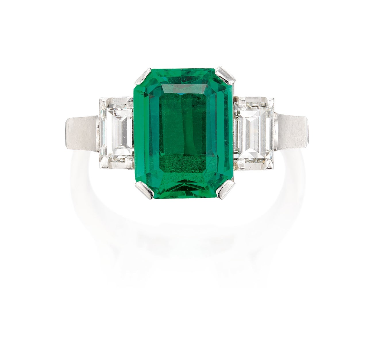 One step-cut emerald, 2.32 caratsFlanked by two baguette diamondsPlatinum(2.32-carat Emerald)