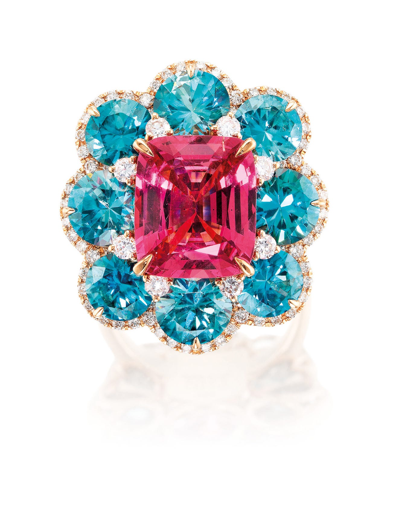 A Pink Spinel, Blue Zircon and Diamond Ring, Stewart Young