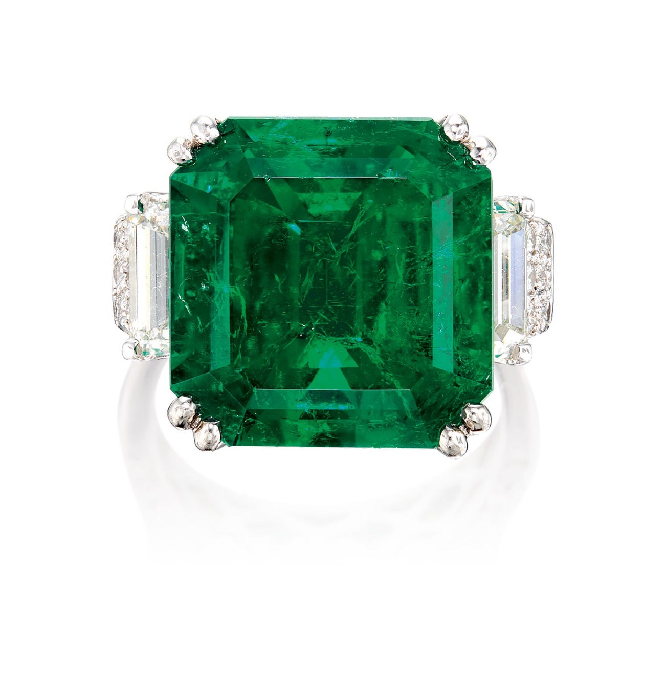 A step-cut emerald, 13.36 caratsEmerald-cut and round brilliant-cut diamonds(13.36-carat Emerald)