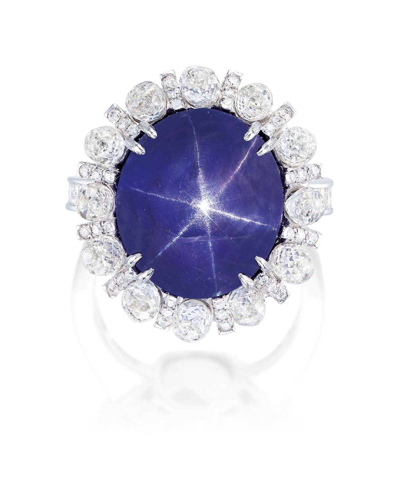 One oval cabochon colour-changing star sapphire, 23.16 caratsSurrounded by briolette diamonds, with brilliant-cut diamonds in the gallery and baguette diamonds on shank18 karat white gold(23.16-carat Star Sapphire)