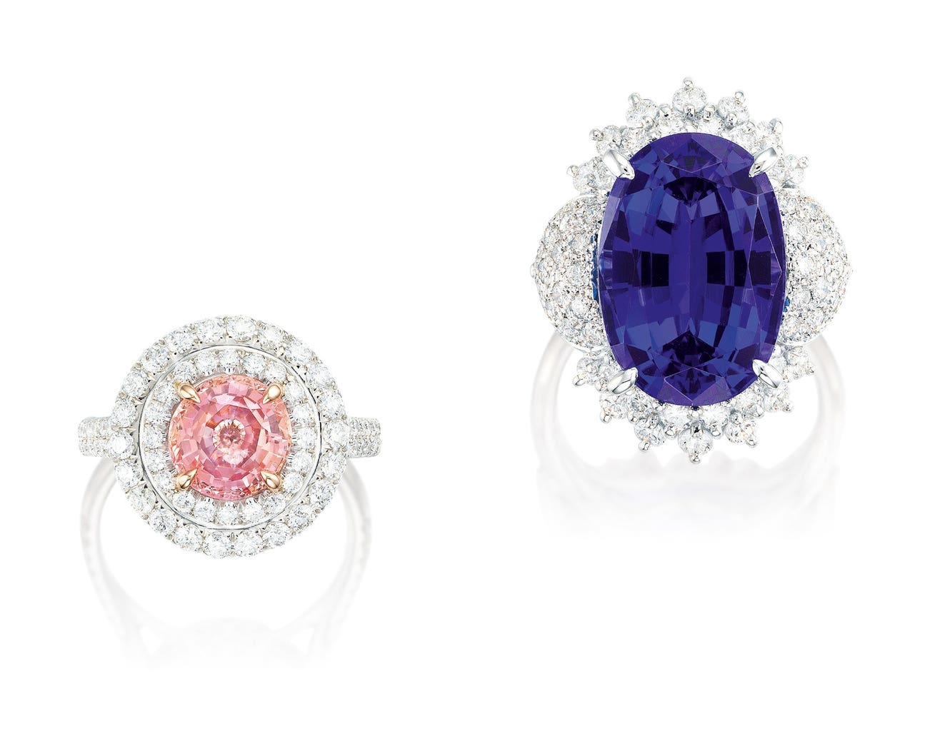 RING ONE - One brilliant-cut padparadscha sapphire, 2.97 carats, with brilliant-cut diamonds in the surround and shank, mounted in 18 karat white and pink goldRING TWO - One oval tanzanite, 10.15 carats, with brilliant-cut diamonds in the surround, mounted in platinum(2.97-carat Padparadscha Sapphire)