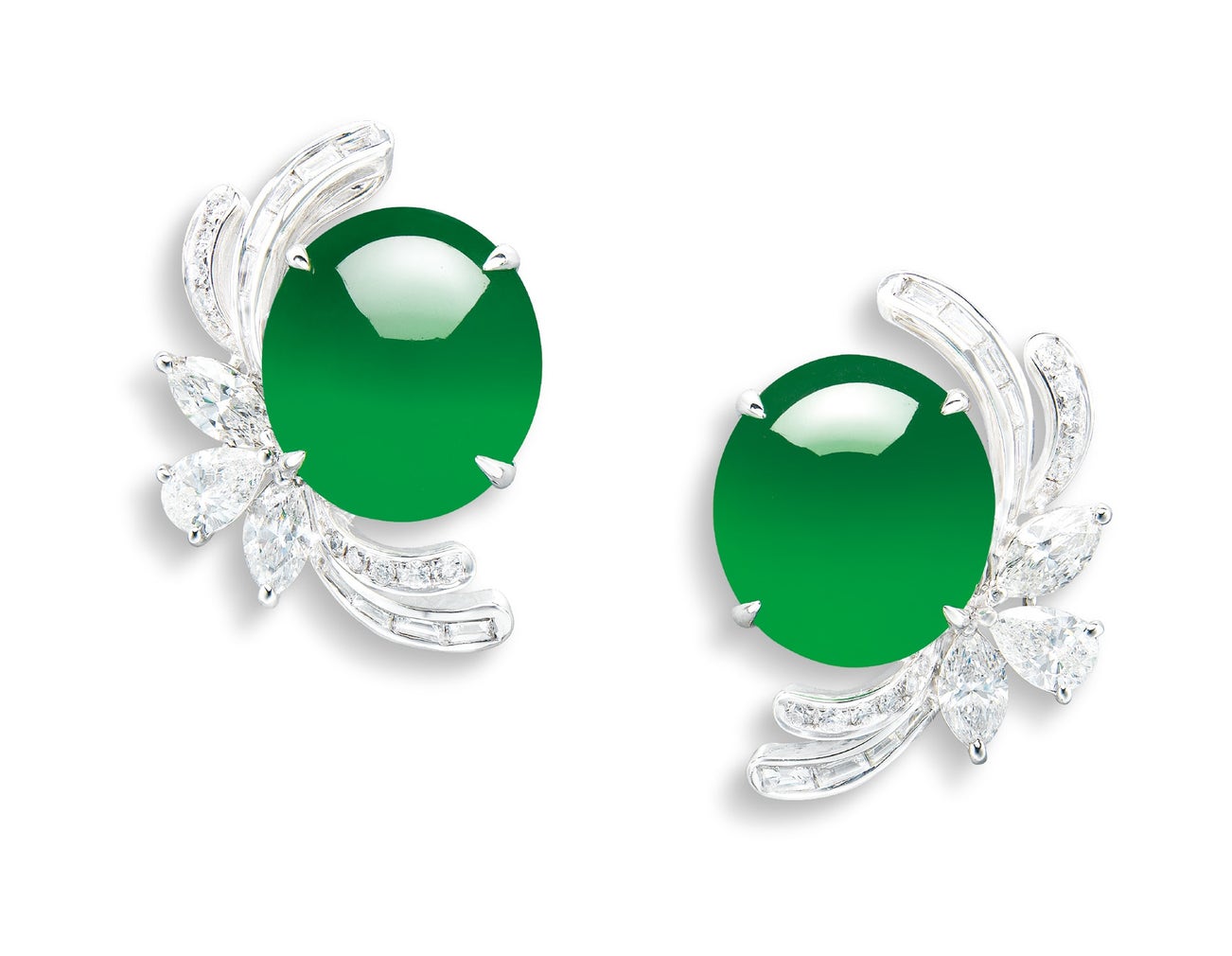 Two oval jadeite cabochons, <em>measuring approximately 13.96 x 12.45 x 5.47mm and 13.88 x 12.49 x 5.35mm respectively </em>Decorated by diamonds of various shapes18 karat white gold(Jadeite Cabochons)