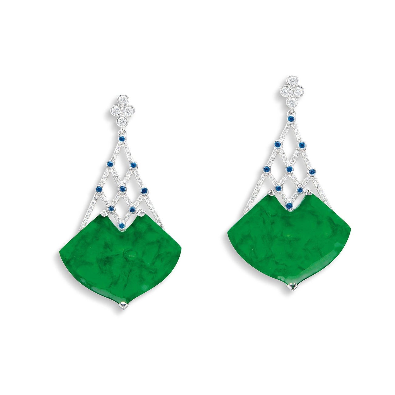 A Pair of Jadeite, Diamond and Sapphire Ear Pendants
