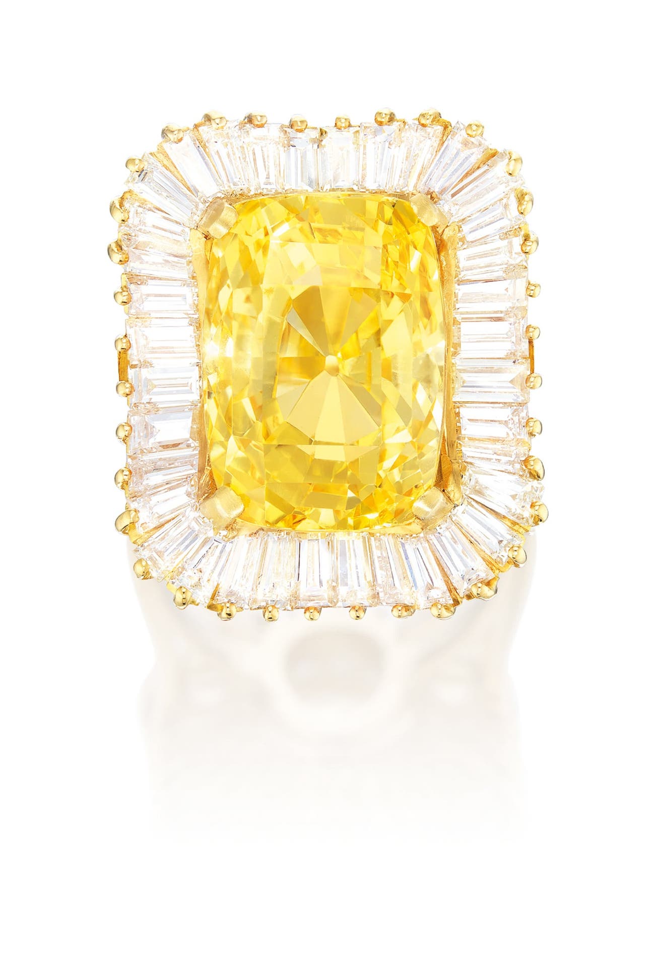 Centring on a cushion-shaped yellow sapphire, 20.57 caratsSurrounded by tapered baguette diamonds18 karat yellow gold(20.57-carat Yellow Sapphire)