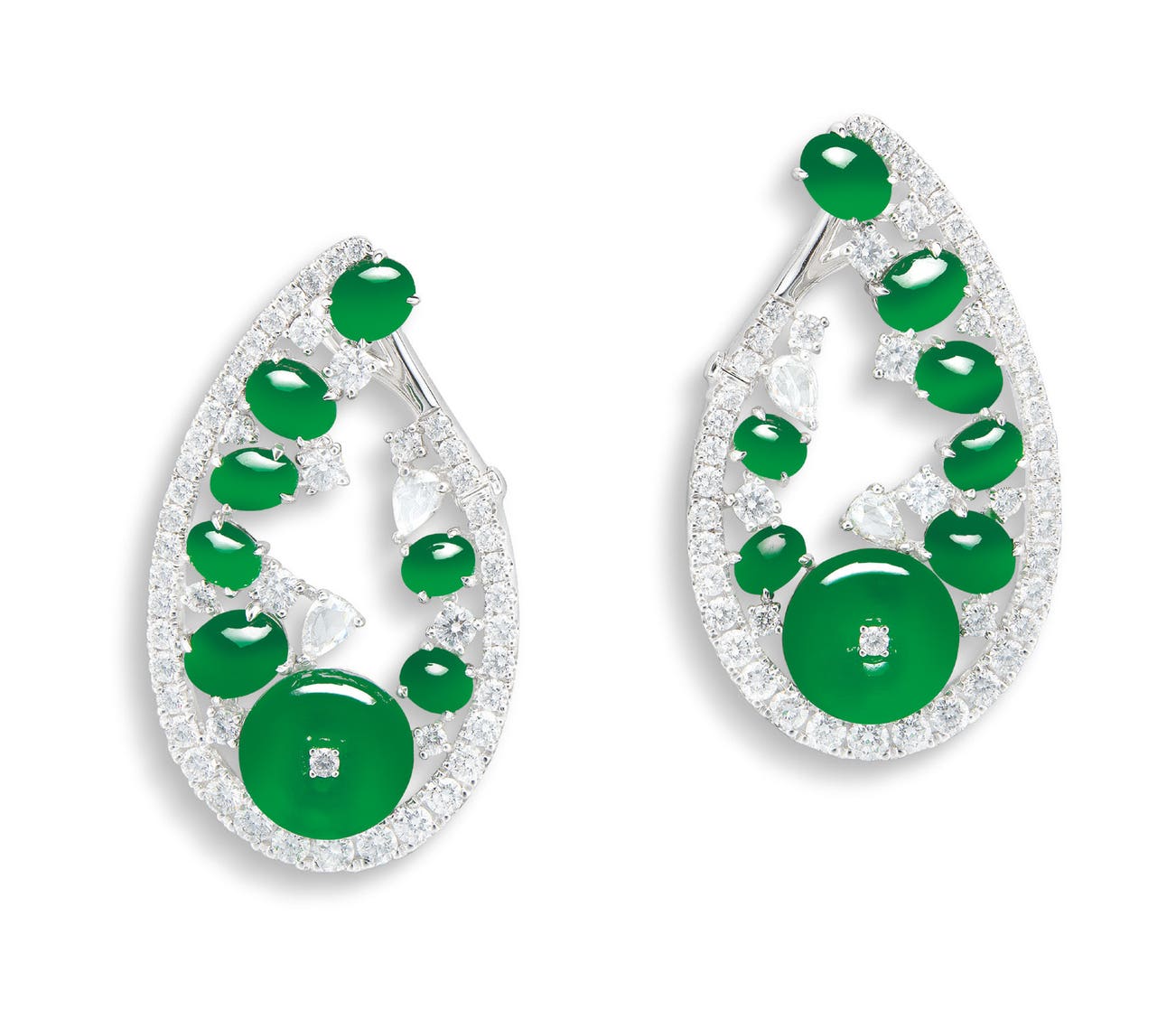 Each set with a jadeite 'huaigu' and seven jadeite cabochonsDecorated with brilliant-cut diamonds throughout the loop18 karat white gold(Jadeite 'Huaigus')