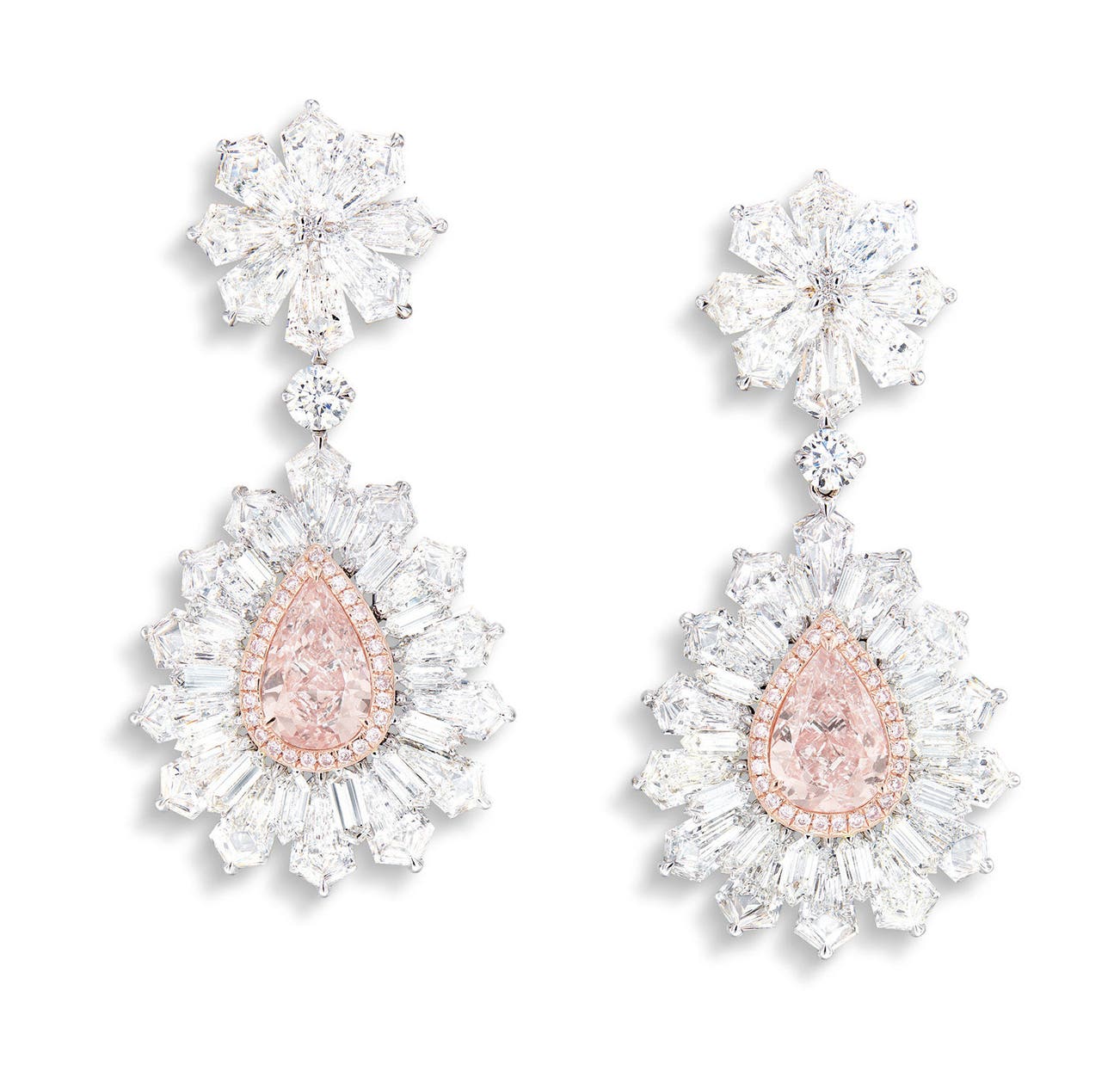 Each suspending a pear-shaped Light Pink and Very Light Pink diamond respectively, 1.38 and 1.59 caratsHighlighted by tiny pink diamonds on borders, further decorated with fancy-shaped diamonds on the surround and surmount18 karat white and pink gold(1.38-carat Light Pink Diamond)