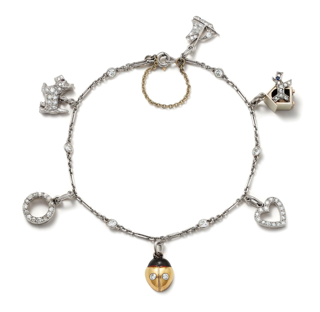 An Art Deco Diamond, Sapphire, Ruby, Enamel, Platinum and Gold Charm Bracelet