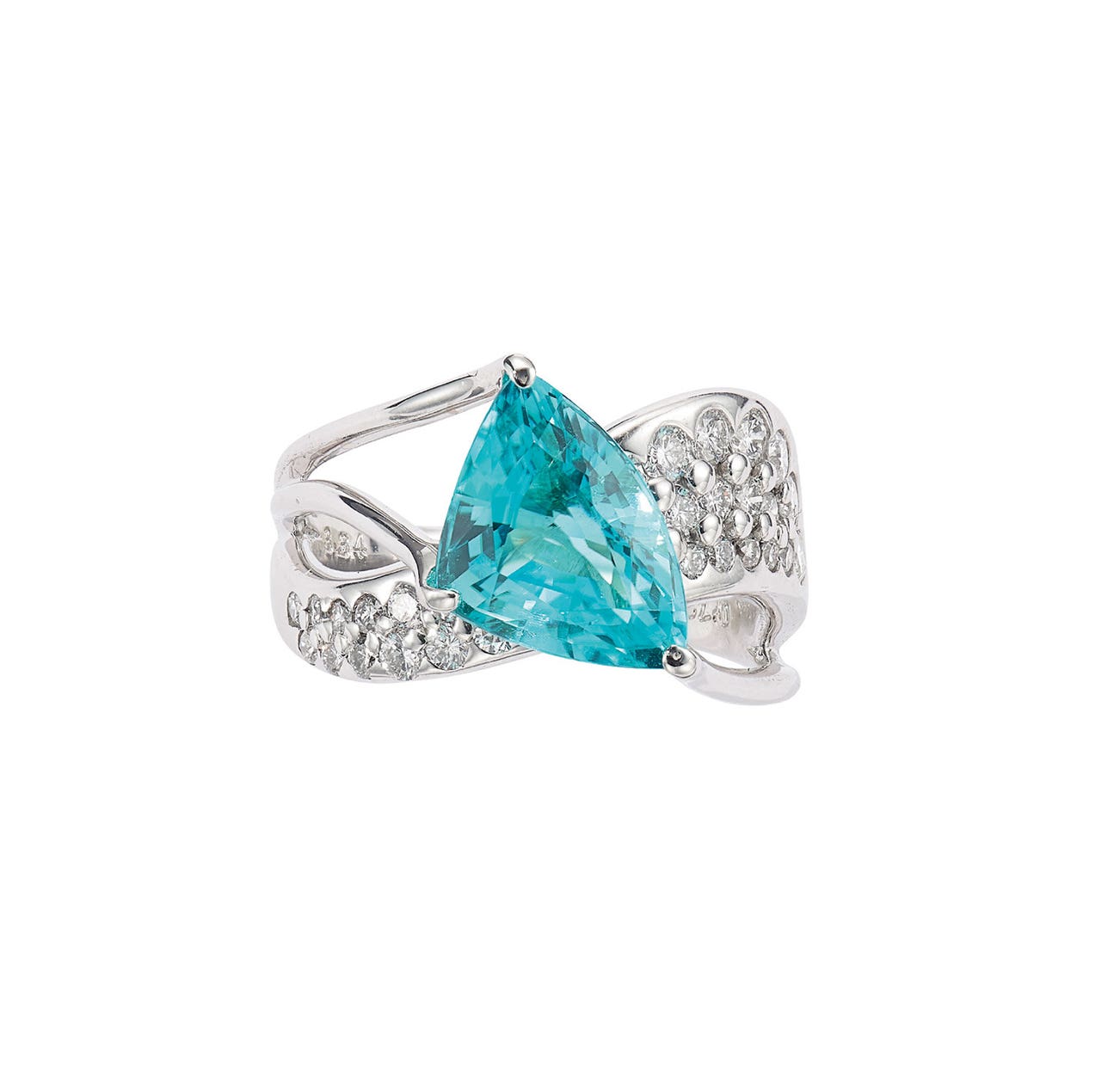One triangular-shaped paraíba tourmaline, 3.34 caratsRound brilliant-cut diamondsPlatinum<em>GIA Report: Brazil, Paraíba Tourmaline</em>