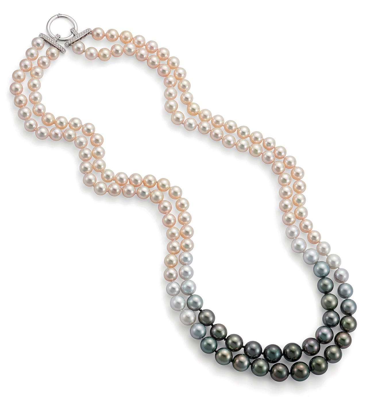 One hundred and thirty-six round cultured pearls, measuring approximately 8.46 mm to 12.35 mmClasp set with round brilliant-cut diamonds18K white gold<em>GIA Report: (Seventy pearls were tested): Saltwater bead cultured pearls, no indications of treatment</em>