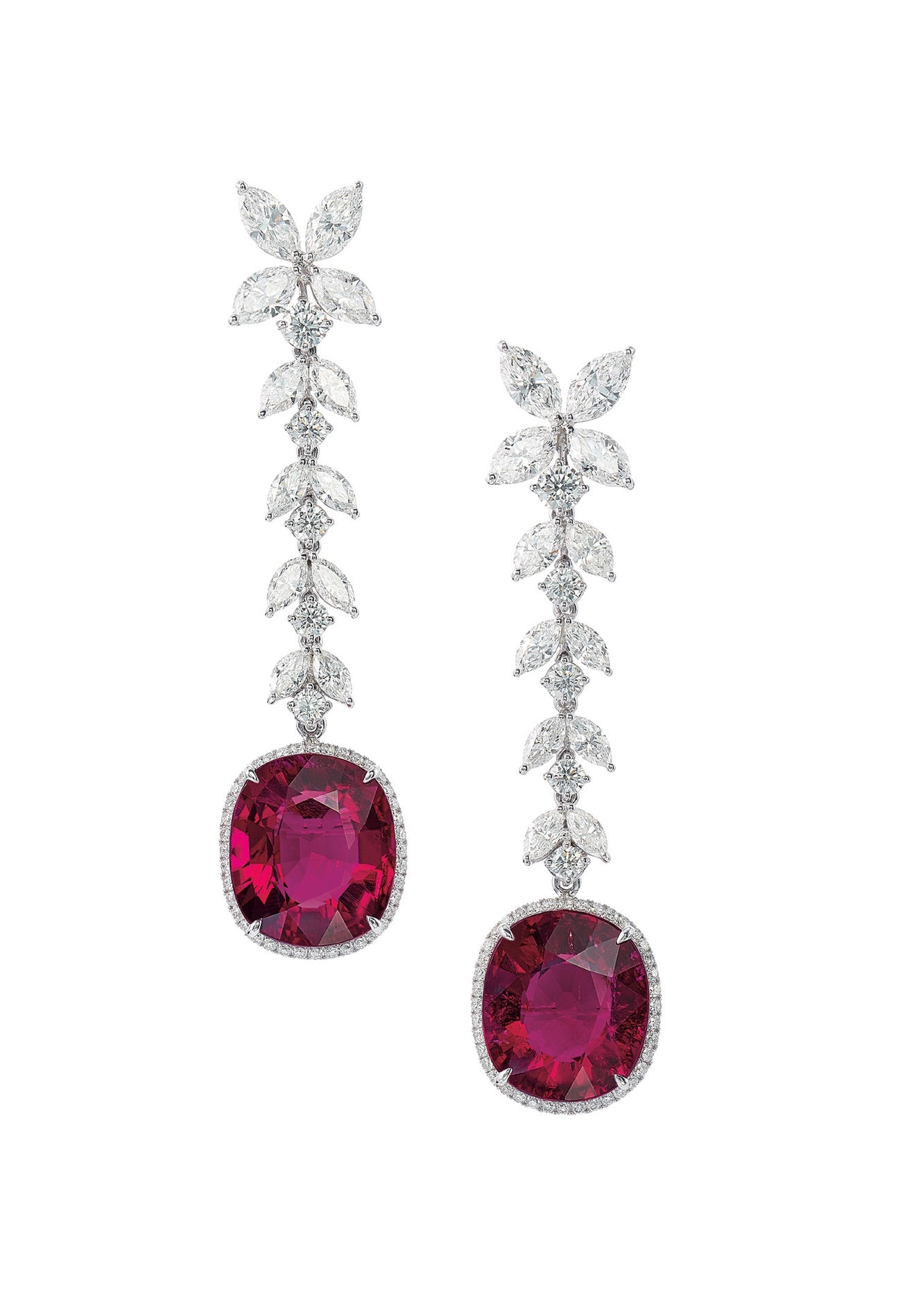 Two cushion-shaped rubellite tourmalines, approximately 21.40 carats totalMarquise-, pear- and round brilliant-cut diamondsPlatinum