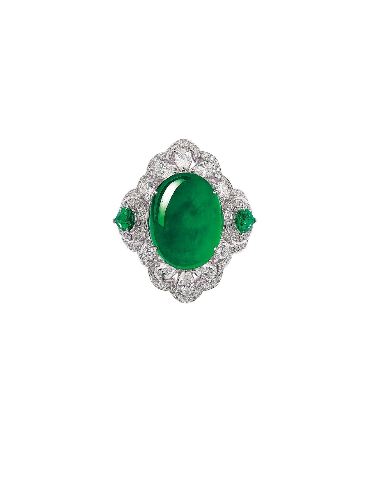 One oval jadeite cabochon, measuring approximately 15.72 x 12.15 x 5.15 mmTwo pear-shaped emeralds