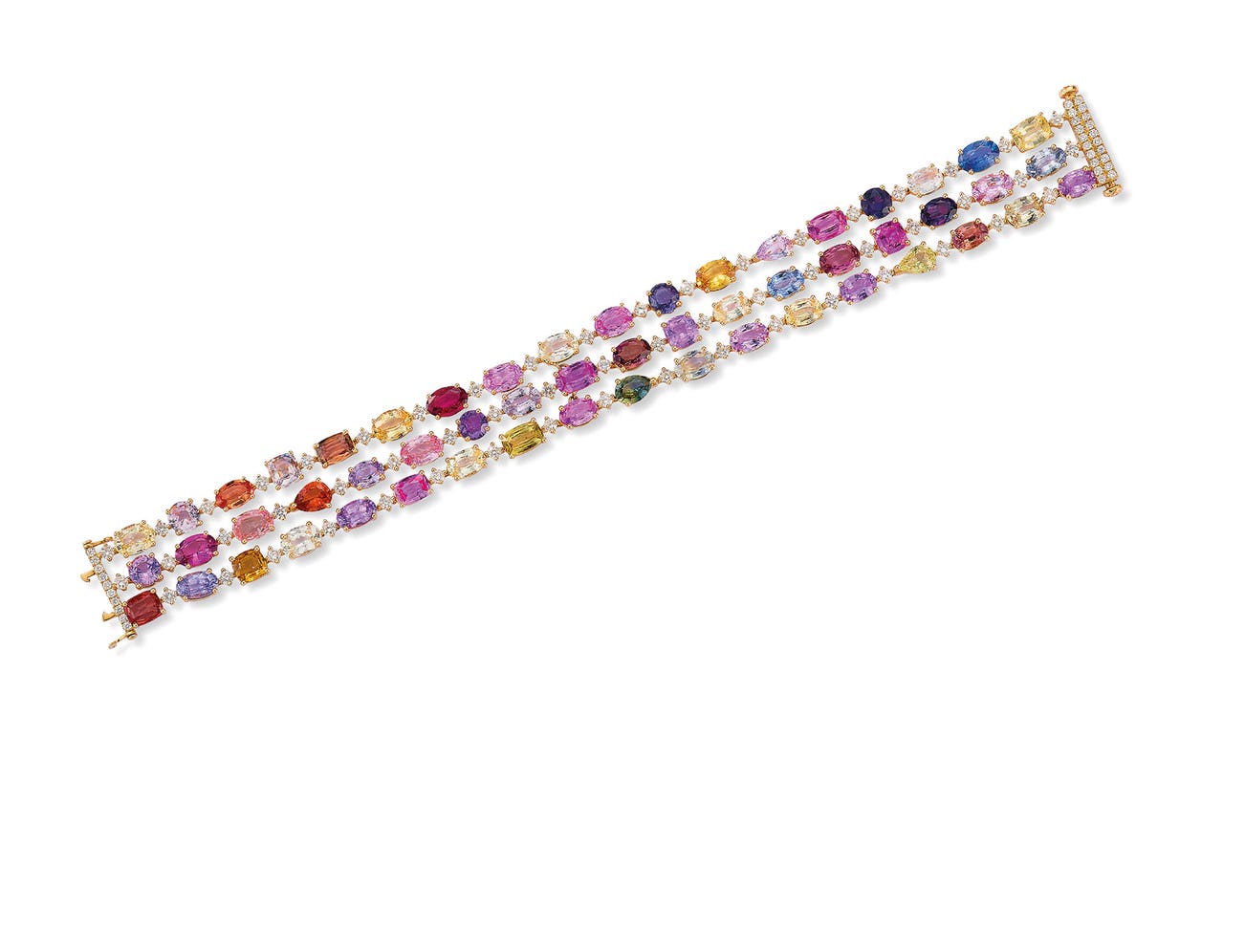 Fifty-four vari-cut multi-coloured sapphiresRound brilliant-cut diamonds18K yellow gold