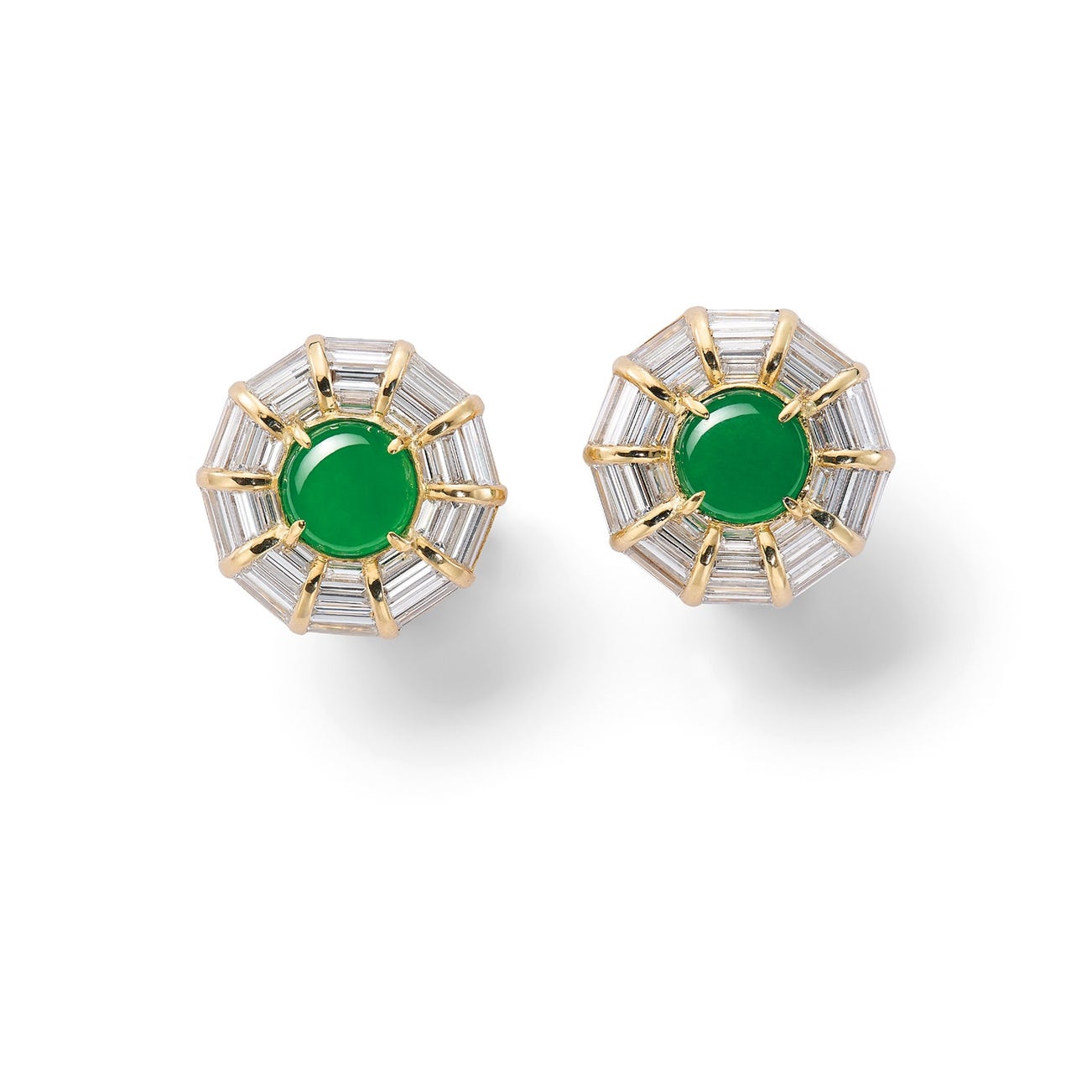 Two round jadeite cabochons, measuring approximately 8.08-8.30 x 2.69 mm and 8.42-8.46 x 2.46 mmBaguette-cut diamonds18K yellow and white goldHong Kong Jade & Stone Laboratory Report: Type A Jadeite, natural colour without any resin