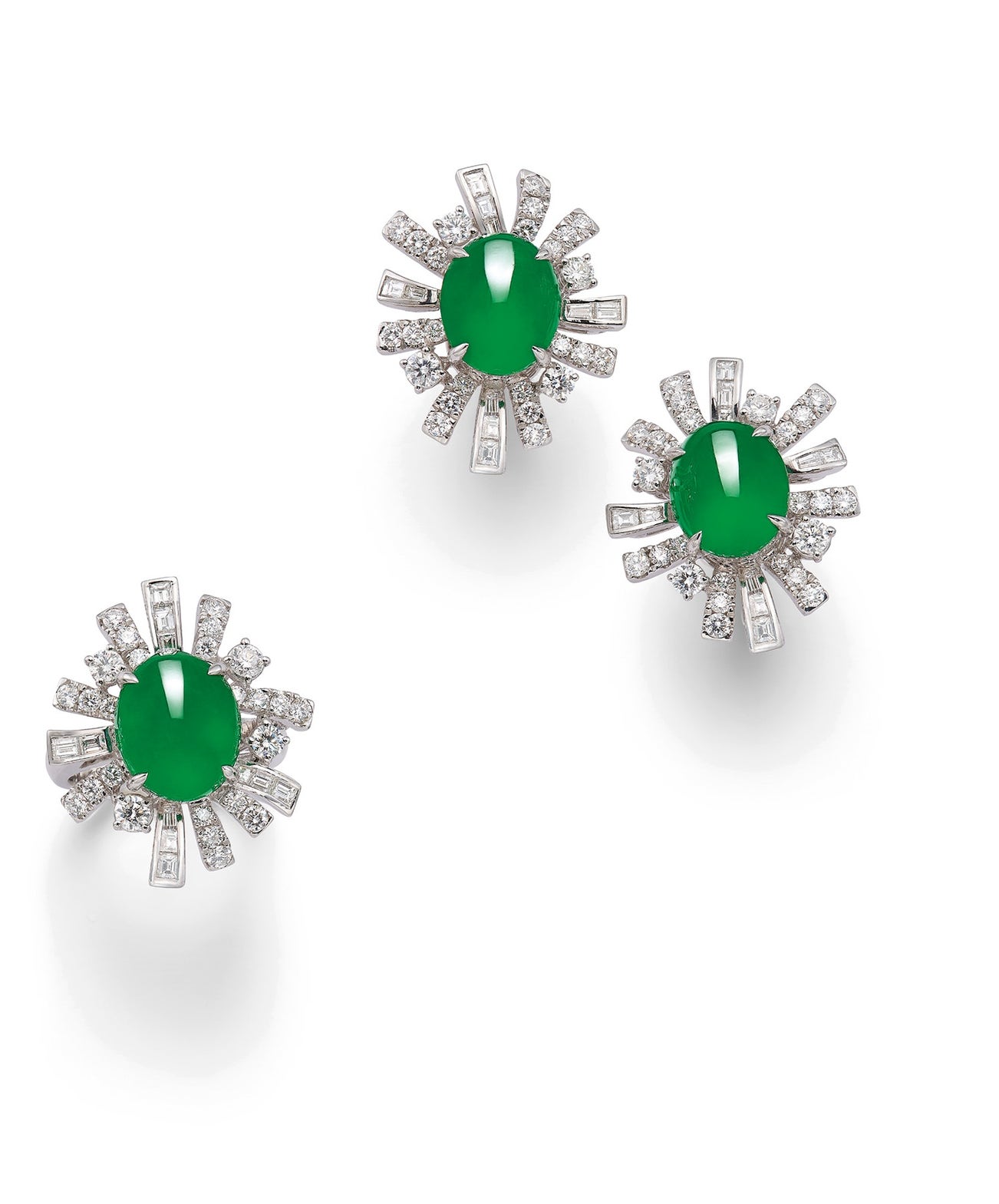Earrings: Two oval jadeite cabochons, measuring approximately 12.18 x 9.90 x 5.47 mm and 12.24 x 10.10 x 5.35 mm respectivelyRound brilliant- and baguette-cut diamonds18K white gold<em>Two Hong Kong Jade & Stone Laboratory Reports: Type A Jadeite, natural colour, without any resin</em>