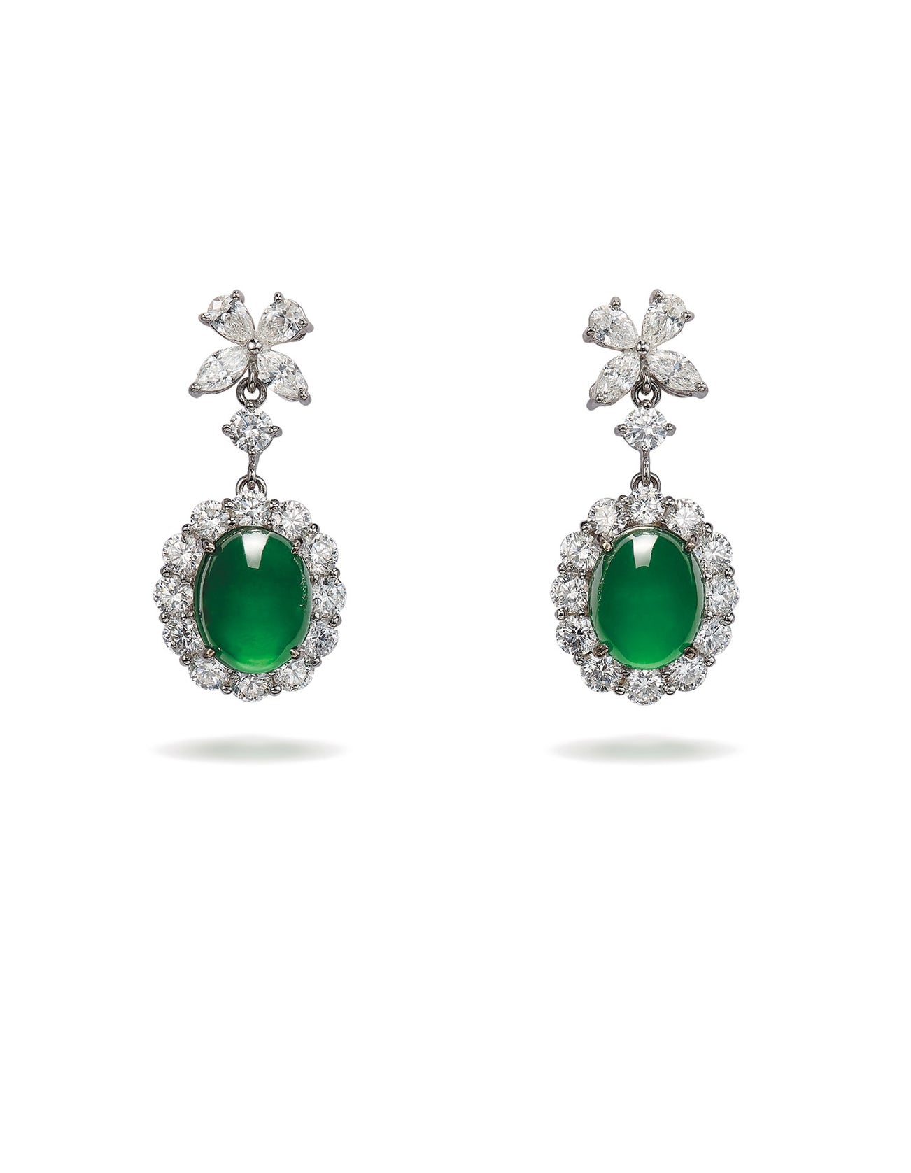 Two oval jadeite cabochons, measuring approximately 9.96 x 7.74 x 4.00 mm and 9.74 x 7.89 x 3.71 mm respectivelyRound brilliant-, marquise- and pear-shaped diamonds18K white gold<em>Hong Kong Jade & Stone Laboratory Report: Type A Jadeite, natural colour, without any resin</em>