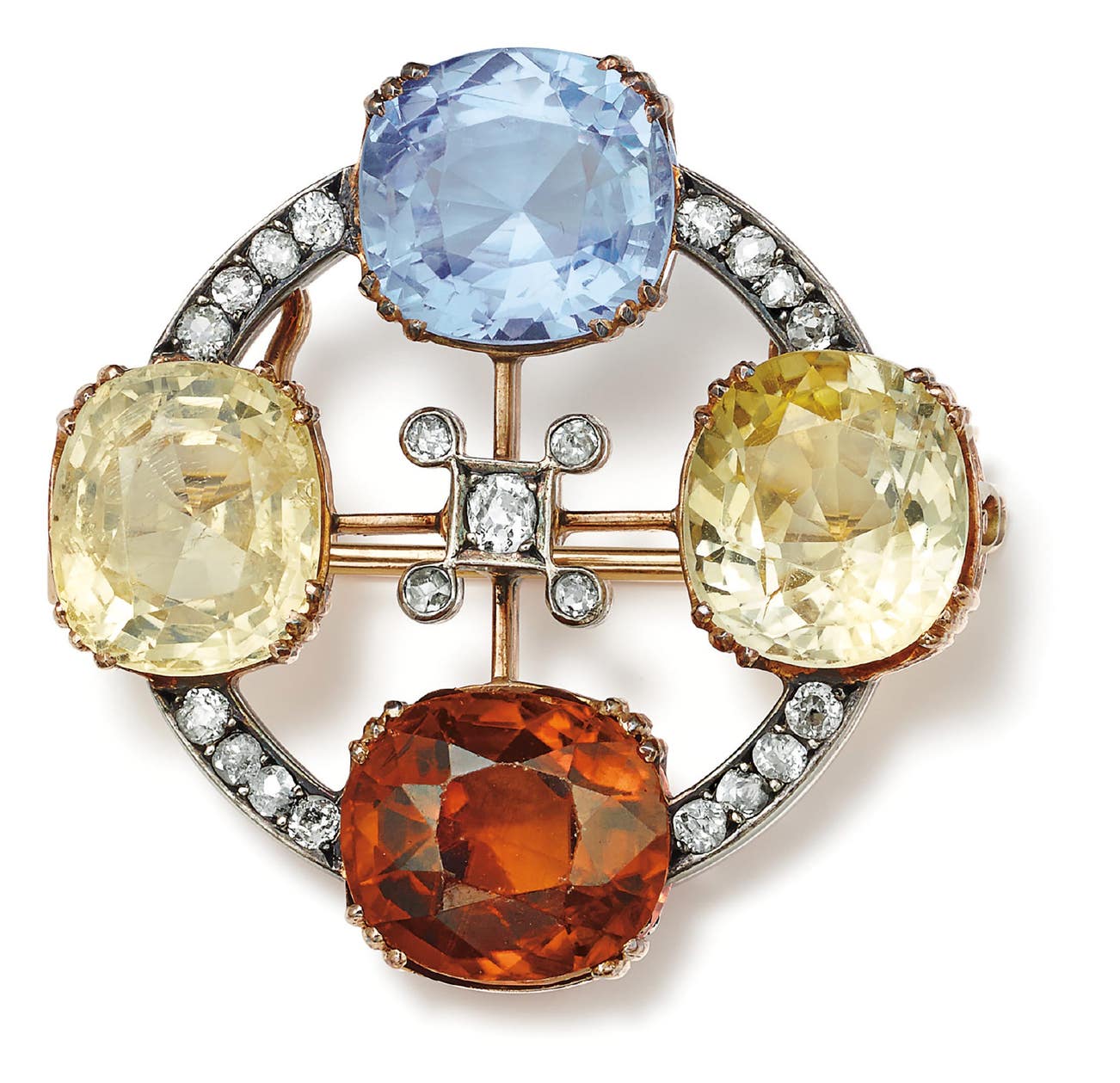 An Antique Multi-Gemstone, Diamond, Gold and Silver Brooch