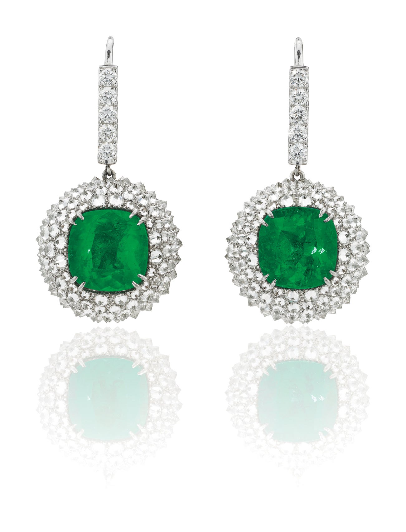 Two cushion-shaped modified brilliant-cut emeralds, total 13.49 carats