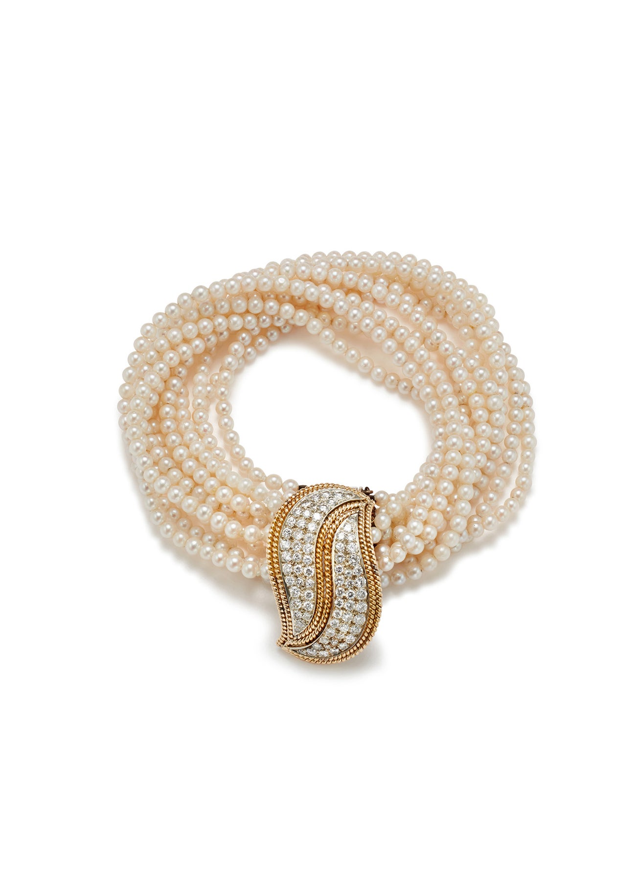 A Diamond, Cultured Pearl and Gold Bracelet/Brooch