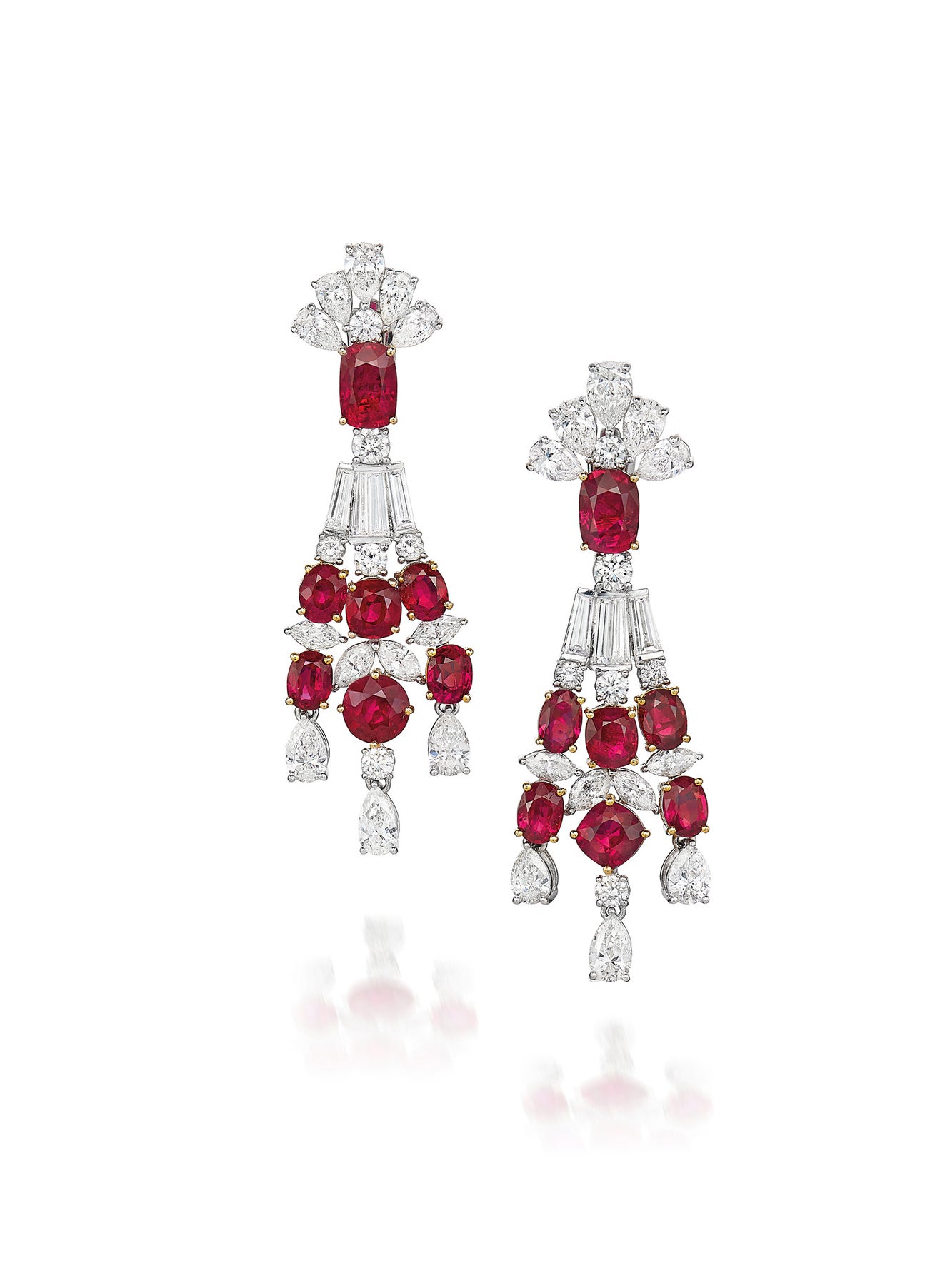 Fourteen cushion-, oval- and circular-cut rubies, 7.26 carats totalVariously cut diamonds, 4.86 carats total18K white gold and gold<em><em>Gübelin Report: Burma, no indications of heating, a few of the rubies are 'pigeon blood red' colour