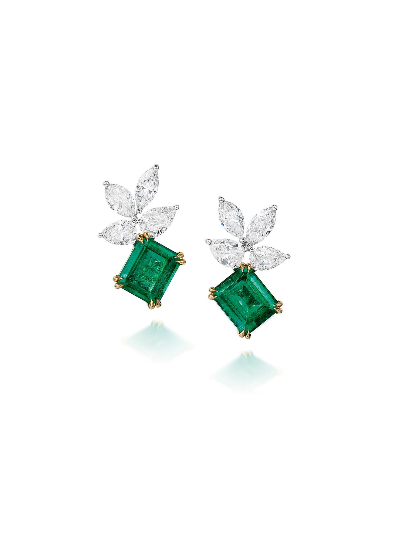 Two octagonal step-cut emeralds, 6.03 carats totalFour pear-shaped and four marquise-cut diamond surmount18K white gold and gold<em>GRS Report: total 6.03 carats, Zambia, minor clarity enhancement</em>