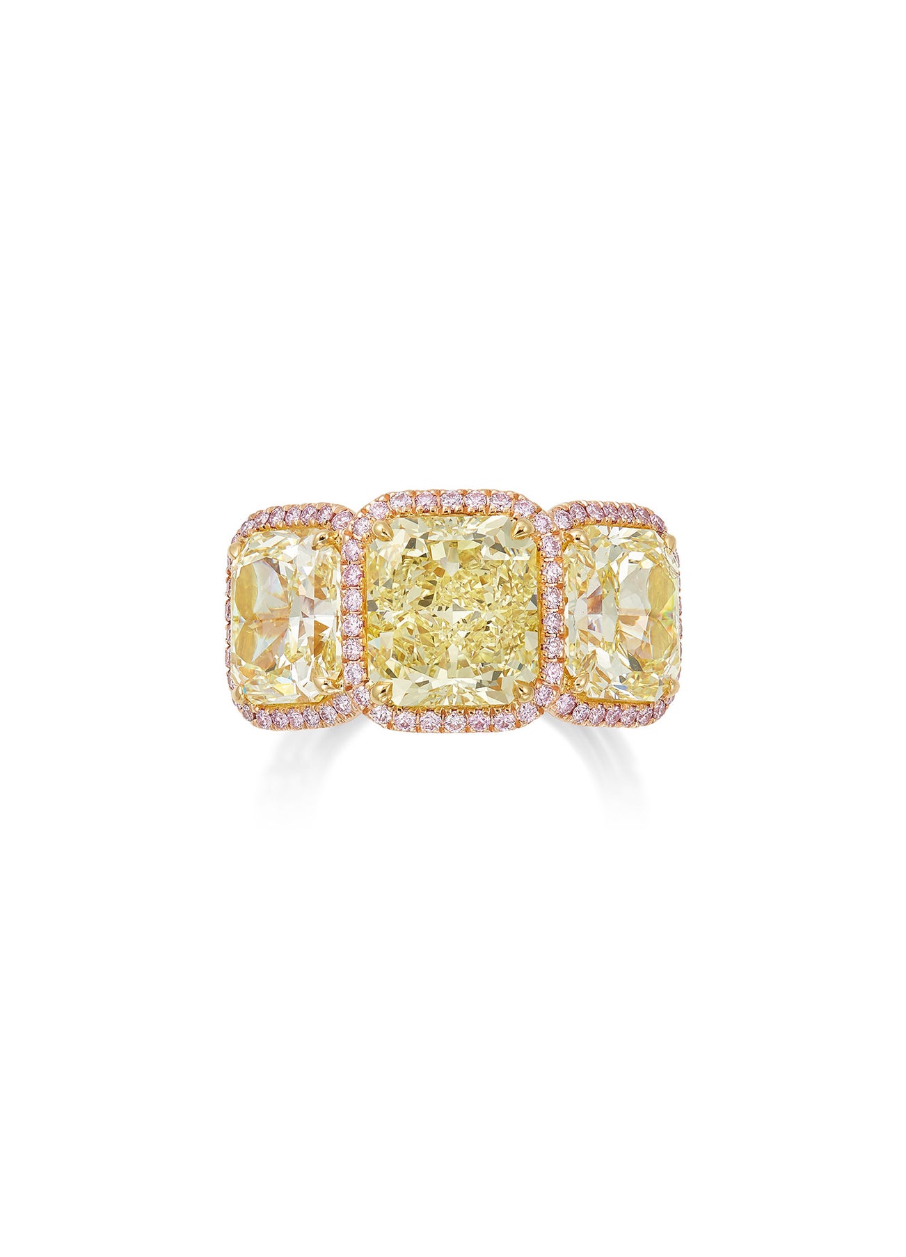 Three cut-cornered rectangular-cut Fancy Yellow diamonds, 4.34, 3.61 and 3.58 carats respectivelyPink diamonds, 0.83 carat total