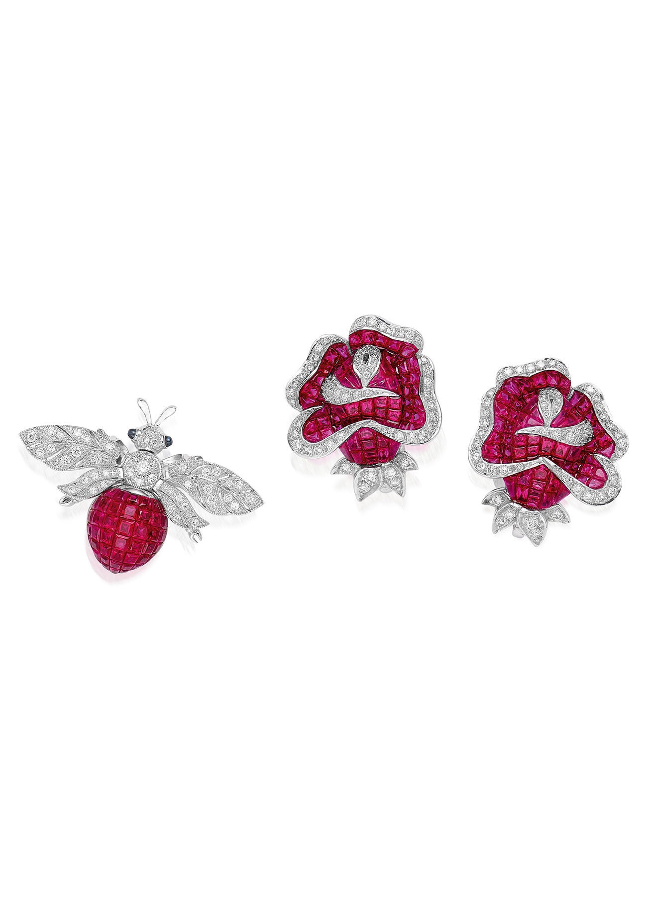 Brooch: Calibré-cut rubies, approximately 3.50 carats total