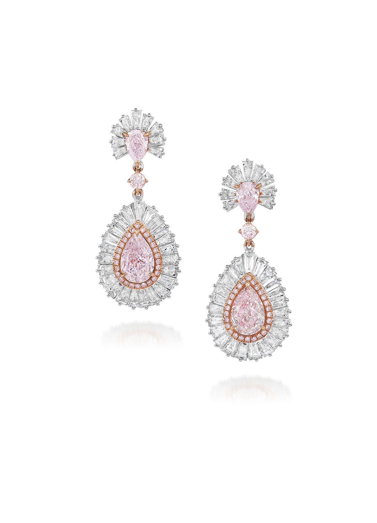 One pear-shaped Very Light Pink diamond, 1.53 caratsTapered baguette-cut diamond surround, 4.68 carats total