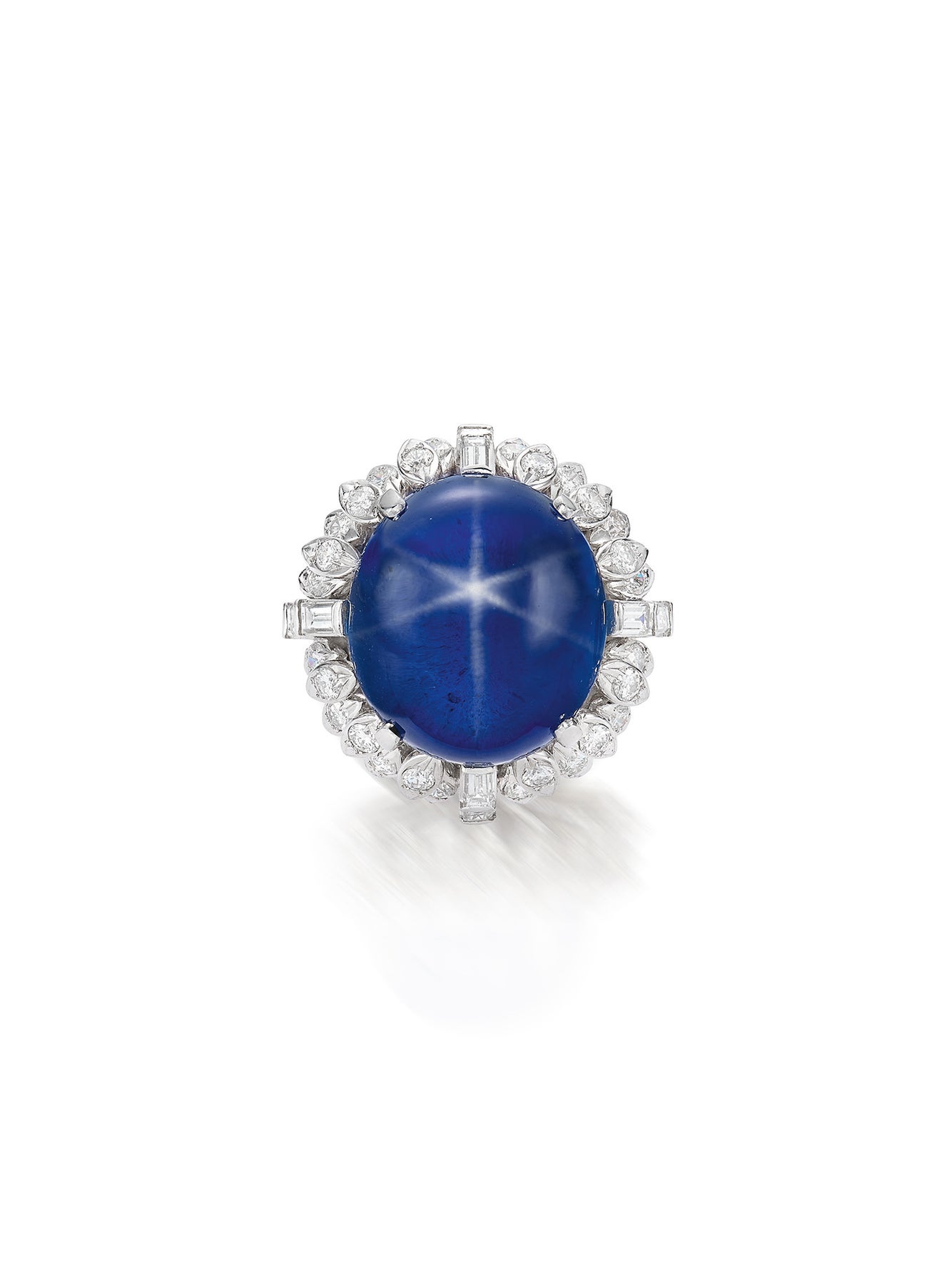 One double cabochon star sapphire, 26.20 caratsBaguette- and brilliant-cut diamondsPlatinum<em>GIA Report: Sri Lanka, no indications of heating, displaying asterism</em>