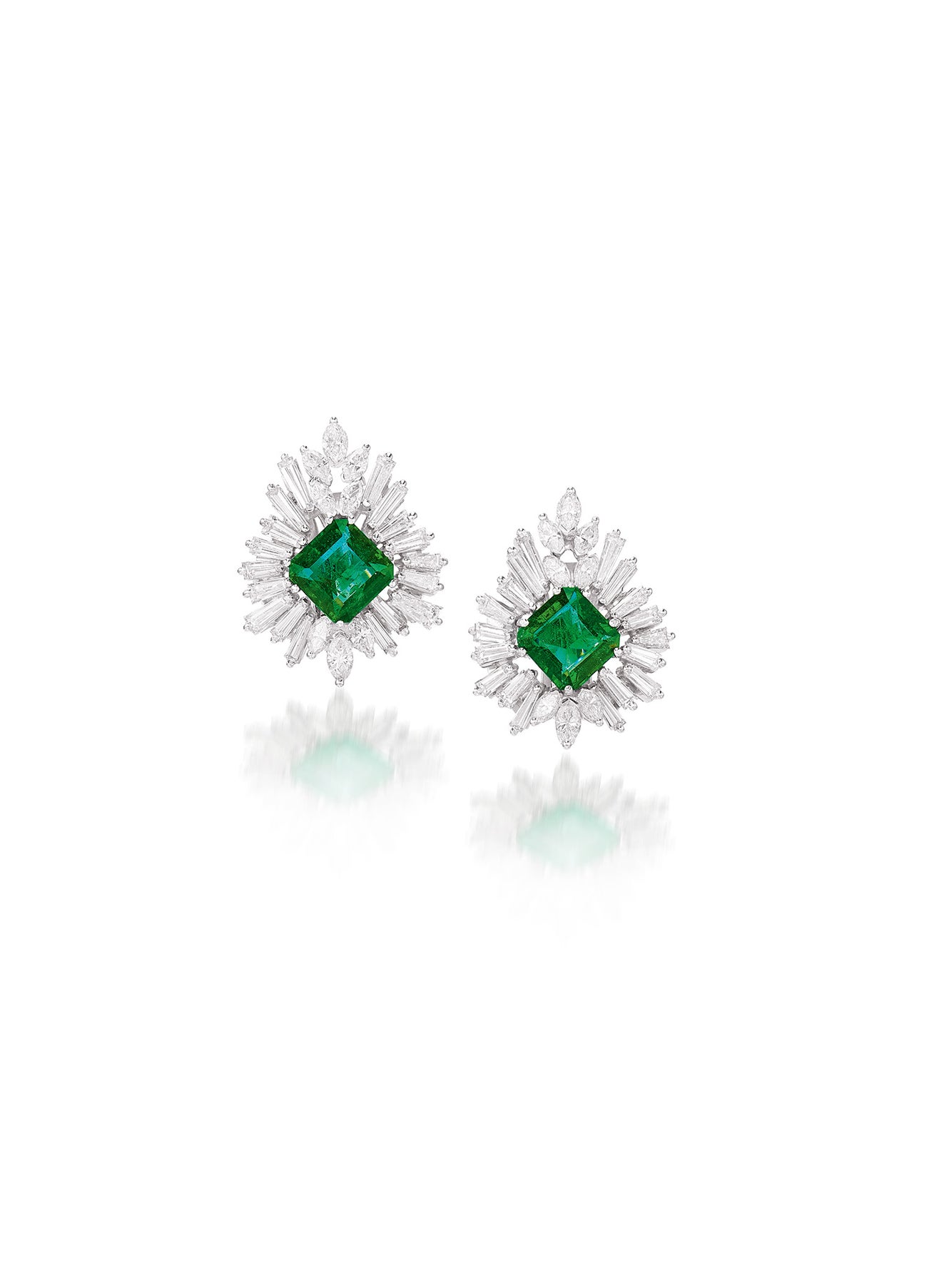 Two octagonal step-cut emeralds, 3.54 carats totalTapered baguette- and marquise-cut diamond surround18K white gold<em>GRS Report: Zambia, insignificant clarity enhancement</em>