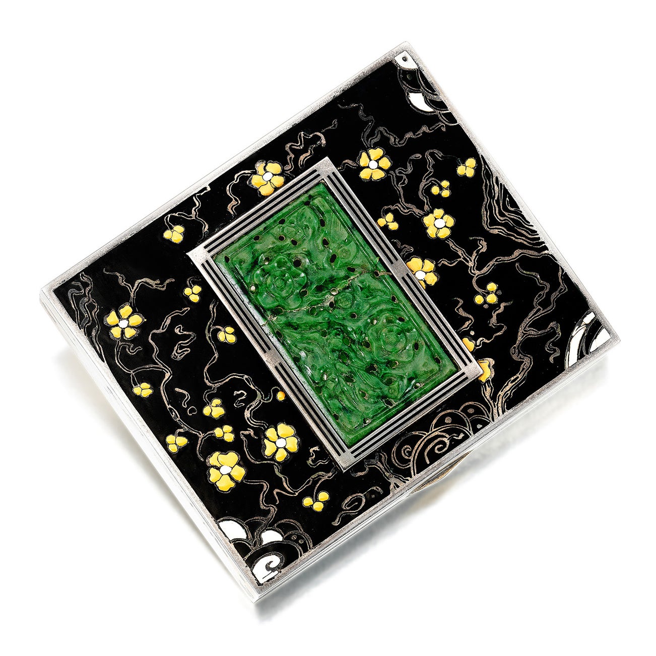 An Art Deco Jade, Enamel, and Sterling Silver Box