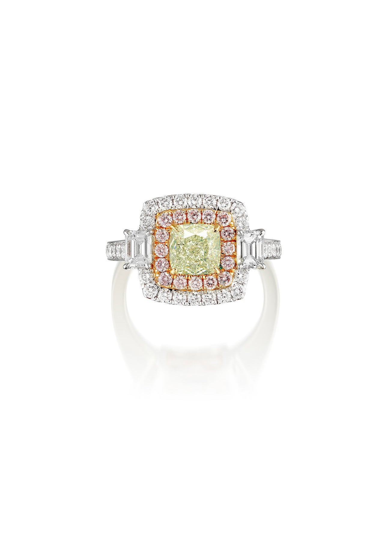 - One modified square brilliant-cut Light Green-Yellow diamond, 1.31 carats