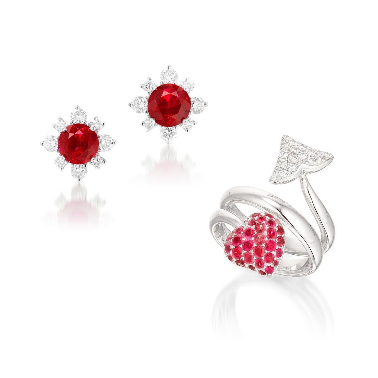 A Set of Spinel and Diamond 'Heart & Arrow' Ring by Dior and A Pair of Ruby and Diamond Earrings