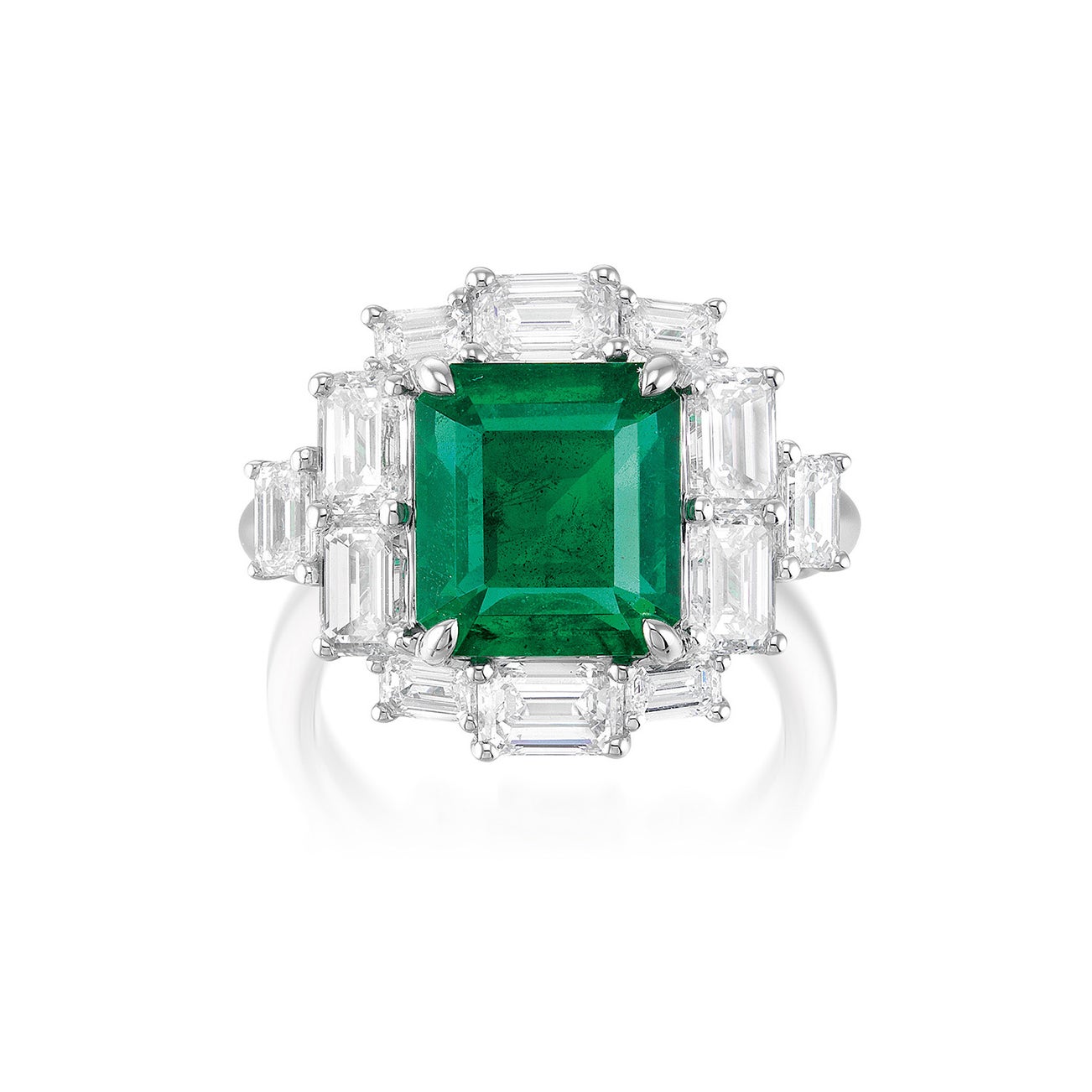 - Twelve emerald-cut diamond surround, 3.24 carats total
