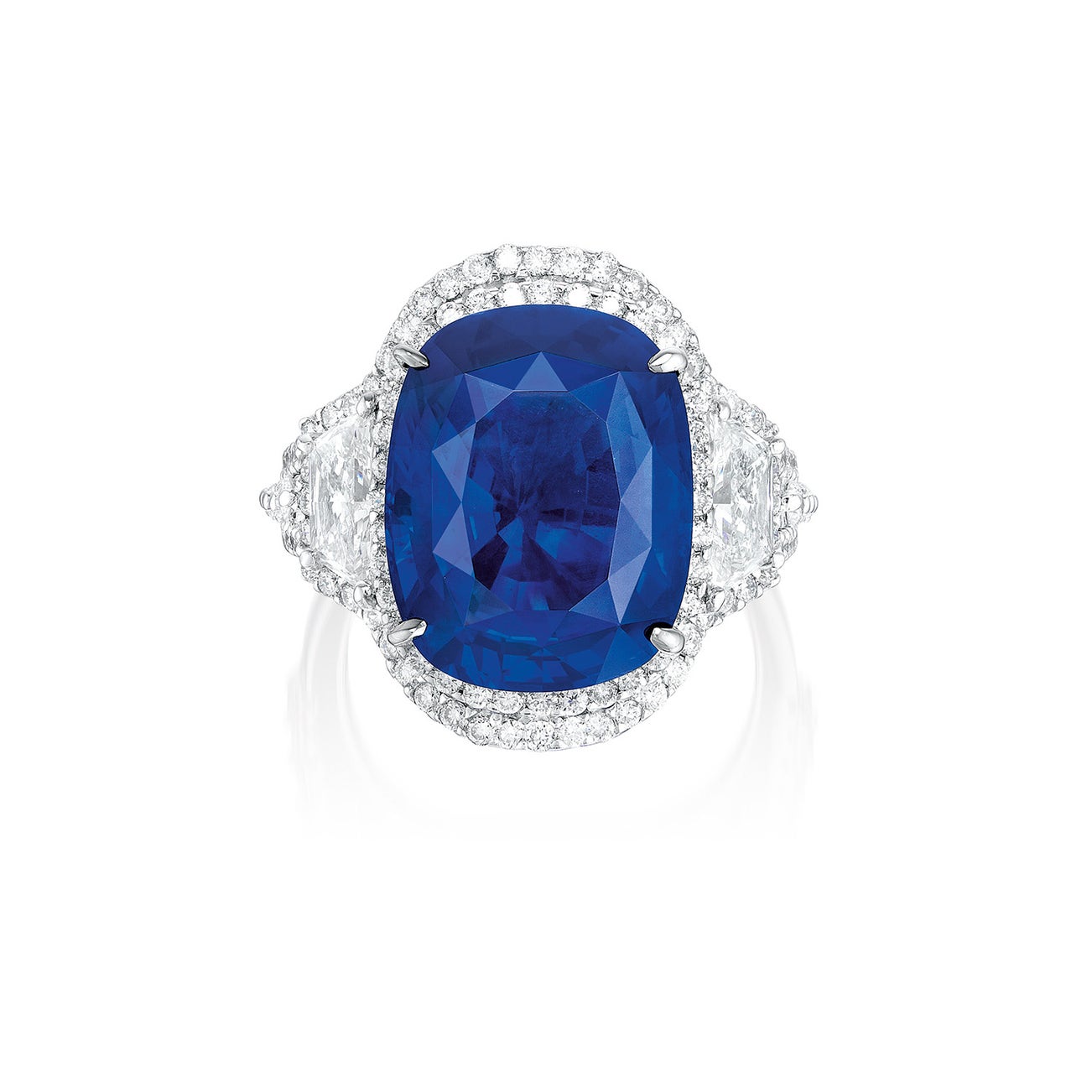One oval-shaped sapphire, 12.29 caratsTrapezoid and brilliant-cut diamond surround and on the sides, 1.40 carats total18K white gold<em>Gübelin Report: Burma, no indications of heating </em>