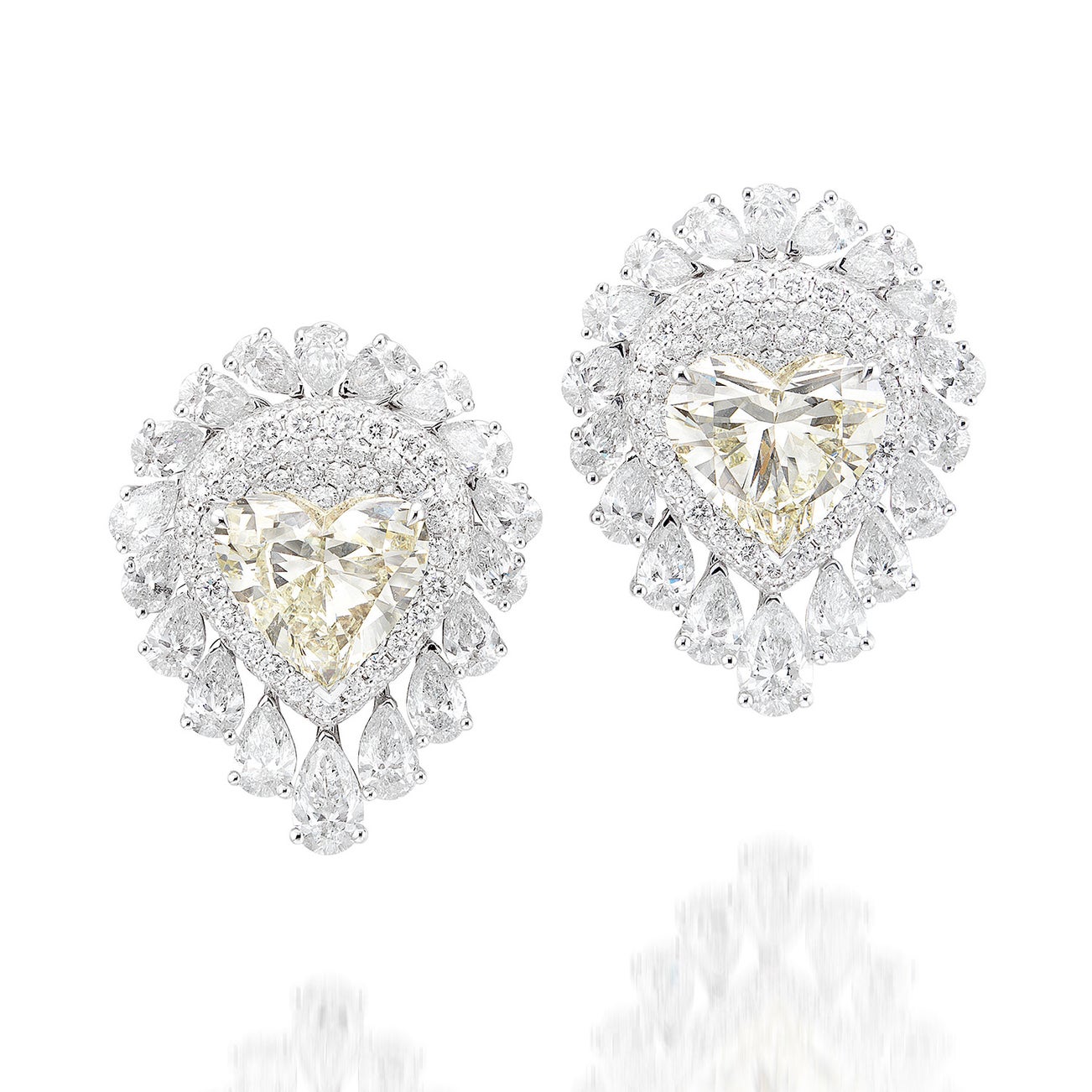 Two heart-shaped diamonds, 4.01 and 4.28 carats respectivelyThirty-six pear-shaped diamond and brilliant-cut diamond surround, approximately 8.80 carats total18K white goldSigned Hermitage<em>GIA Report: L colour, VS2 clarity