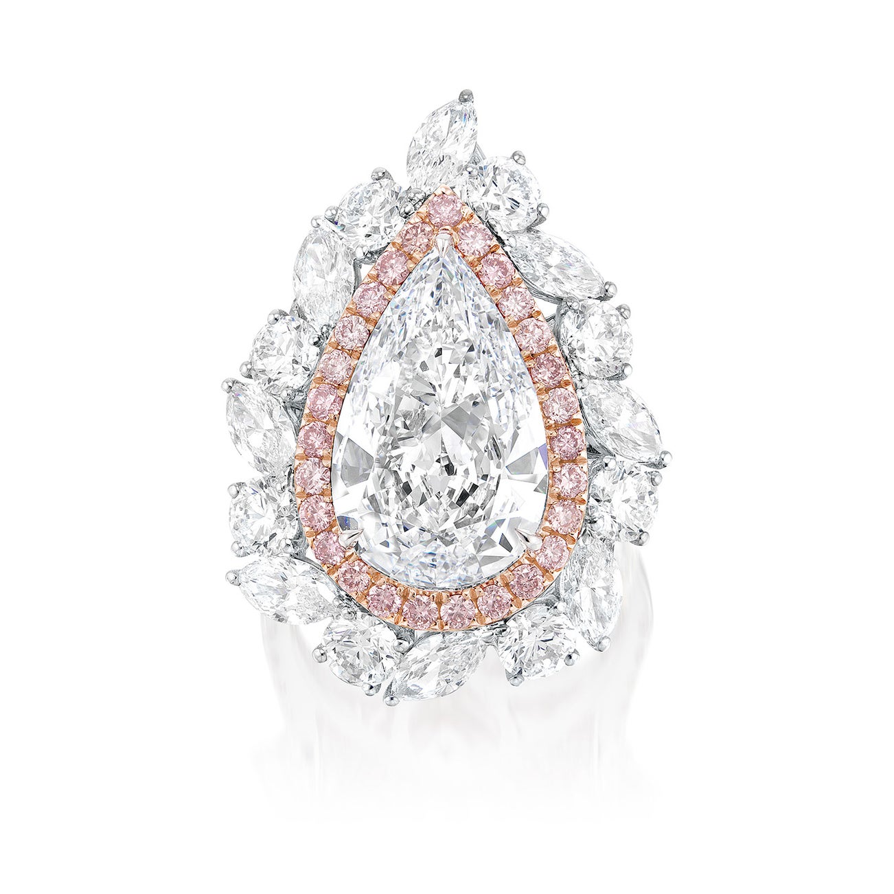 One pear-shaped diamond, 5.51 caratsEight marquise and eight brilliant-cut diamond surround, 1.62 and 1.87 carats respectively