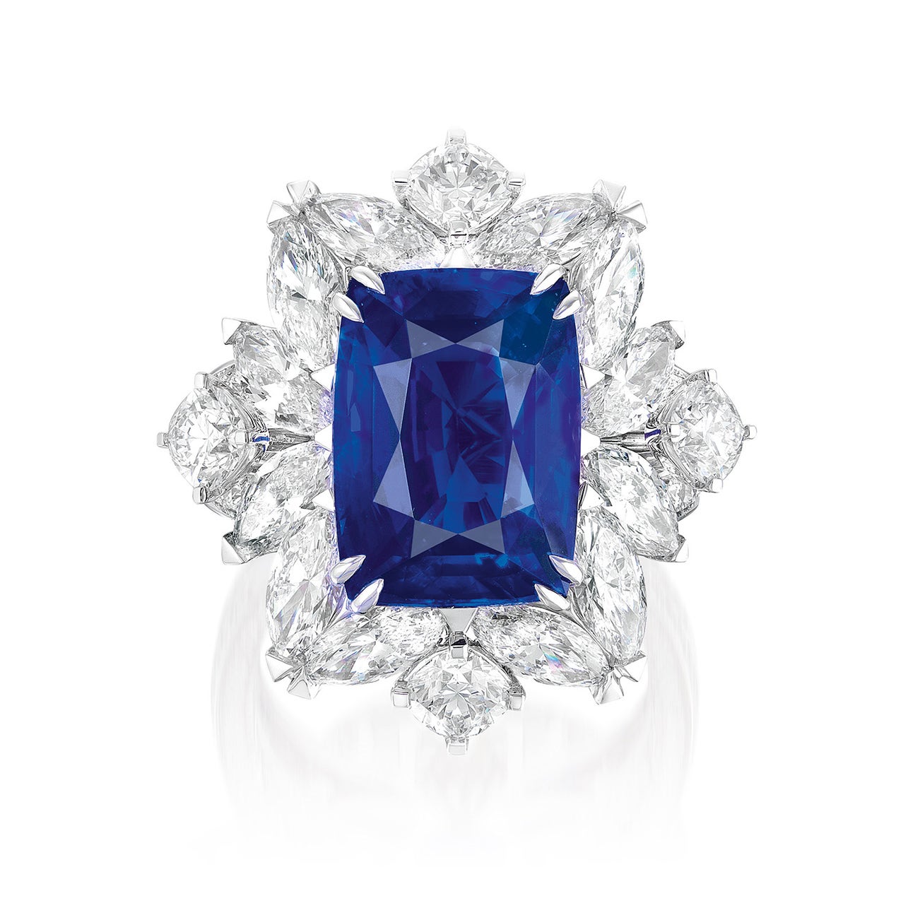 One cushion-shaped sapphire, 11.02 caratsVariously cut diamonds, 6.05 carats total18K white goldSigned Hermitage<em>GRS Report: Sri Lanka, with gemological evidence of heat enhancement, ‘Royal Blue’ colour</em>